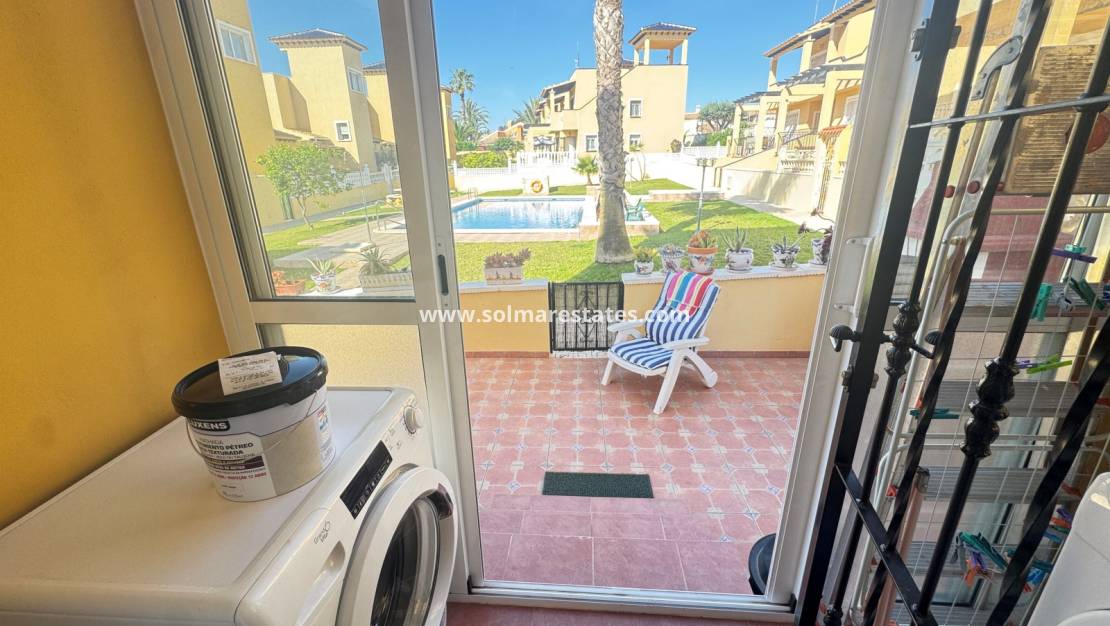 Con un solárium privado en la azotea con hermosas vistas a la piscina comunitaria, esta casa se ofrece en muy buenas condiciones y se vende parcialmente amueblada.