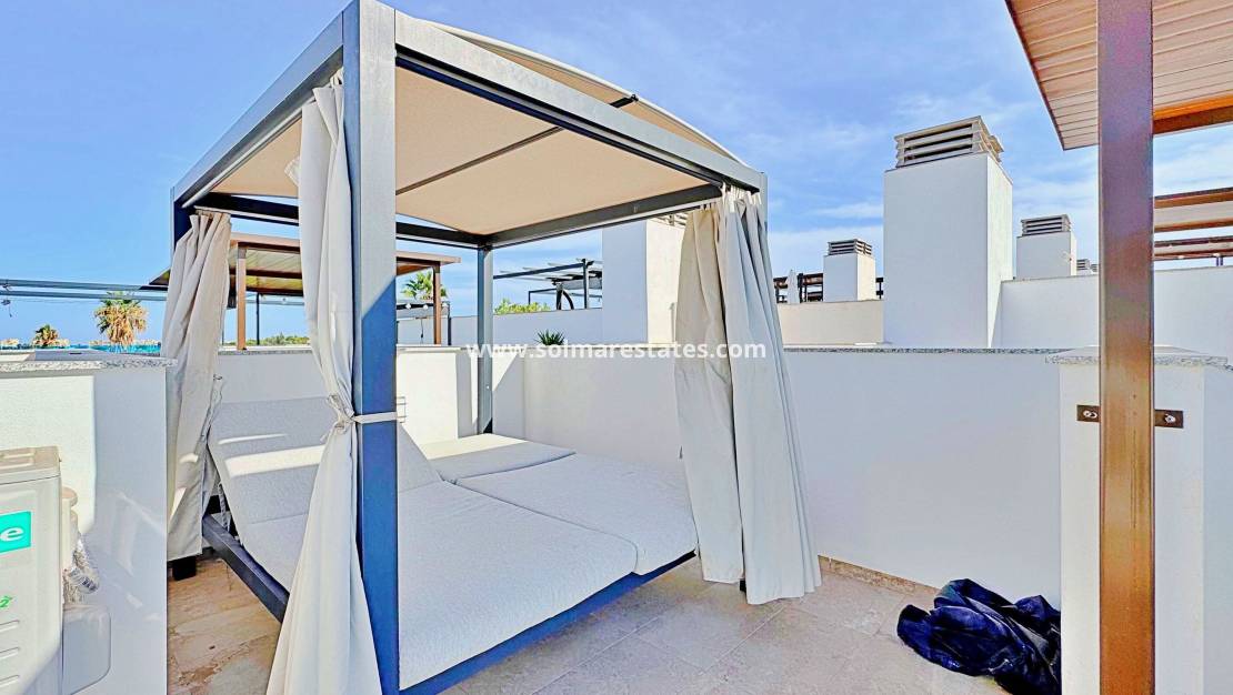Amplio solárium con zona chill-out, pérgola, barbacoa, tumbonas y vistas panorámicas a la laguna de Torrevieja.
