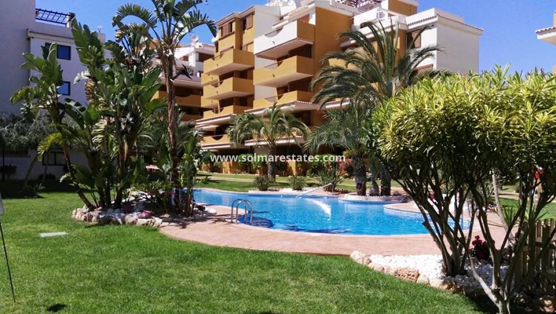 Ático en el complejo residencial La Entrada en Punta Prima. La propiedad tiene una superficie total de 70 m² y consta de 2 dormitorios, 2 baños y un amplio salón con cocina americana.