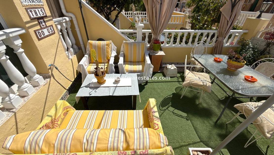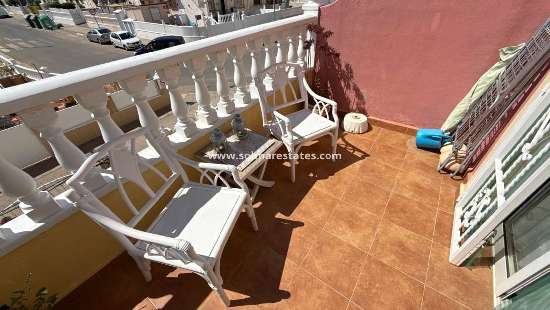 Esta casa adosada, bien ubicada, ofrece una soleada terraza delantera con aparcamiento privado y un porche acristalado que da al salón. La planta baja incluye un aseo de cortesía, una cocina americana con lavadero y una habitación adicional cubierta, ideal como comedor o como posible tercer dormitorio.