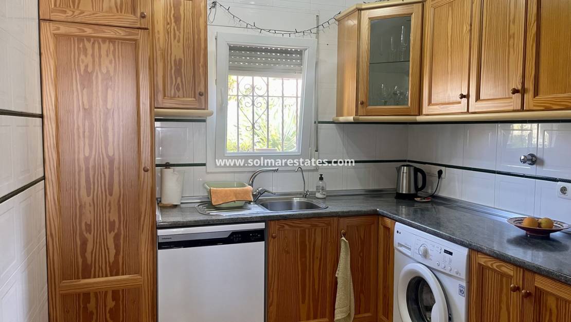En el interior, la casa cuenta con un amplio salón con puertas plegables, una cocina independiente totalmente equipada y tres dormitorios bien distribuidos, incluyendo uno principal con baño en suite. Otras características destacadas incluyen aire acondicionado, calefacción central, amplio espacio de almacenamiento y un solárium privado con impresionantes vistas a la Sierra de Callosa y al campo circundante.