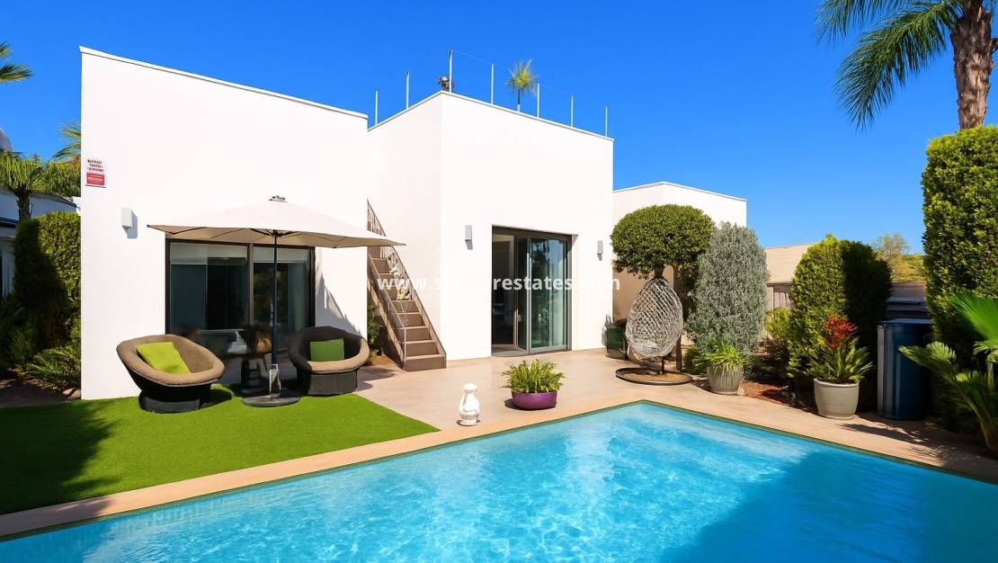 Ubicada en una parcela de 435 m² con 120 m² de espacio habitable contemporáneo, la villa cuenta con un amplio salón y comedor con aire acondicionado y grandes puertas de doble acristalamiento que se abren a un jardín de bajo mantenimiento con césped artificial y una piscina privada.