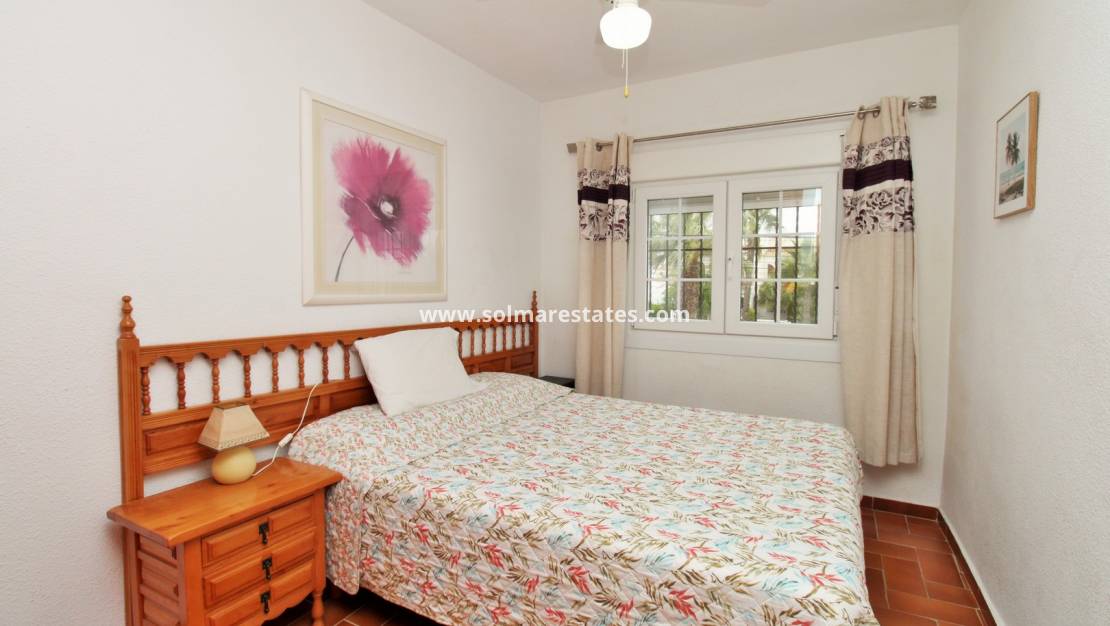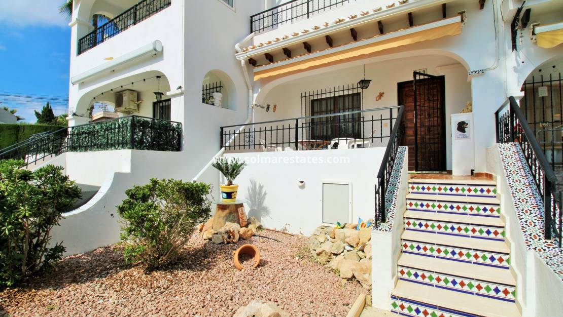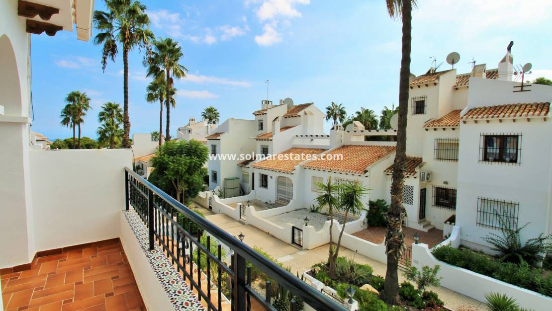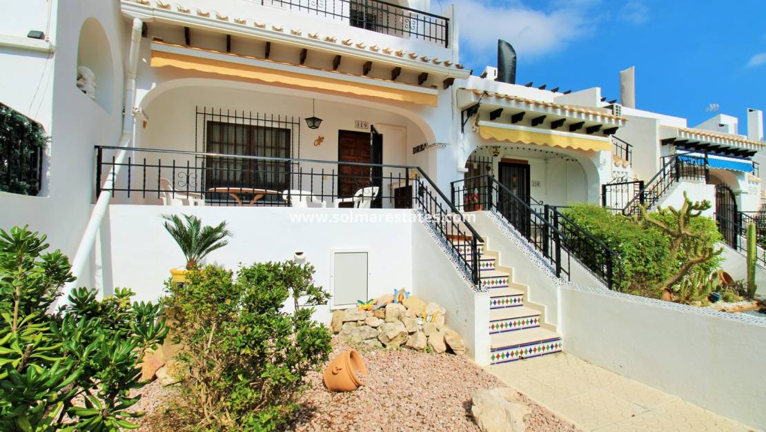 Esta atractiva casa adosada de estilo sofia se encuentra en la codiciada urbanización Verdemar III de Villamartín. La propiedad disfruta de una hermosa vista a la fuente central y ofrece amplias zonas exteriores, incluyendo jardines delantero y trasero, una terraza cubierta y un solárium privado en la azotea con vistas al mar.