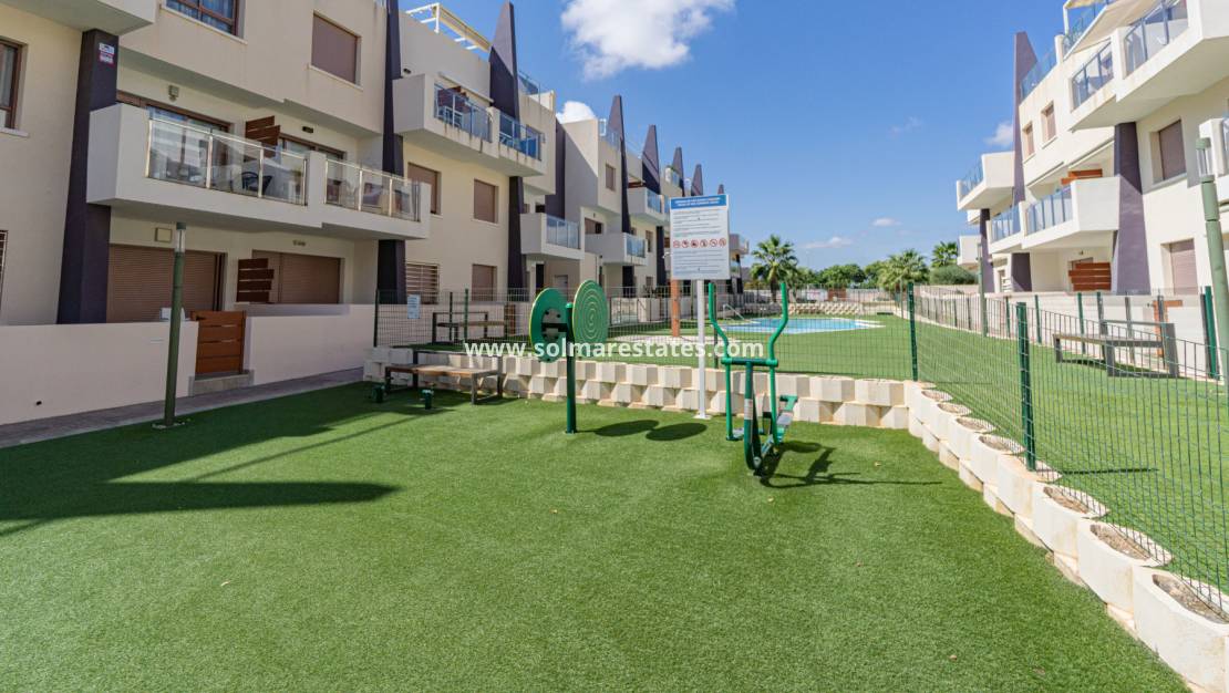Las instalaciones comunes incluyen dos piscinas, zonas de juegos infantiles, espacios compartidos y aparcamiento para bicicletas. La orientación norte-sur permite una exposición solar óptima durante todo el día.