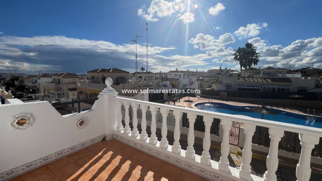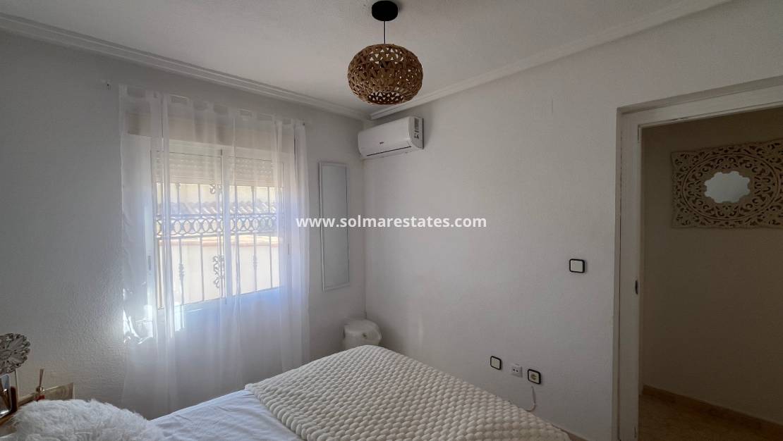 Una escalera interior conduce a la planta superior, donde se encuentra el dormitorio principal , equipado con armarios empotrados, aire acondicionado frío/calor y acceso a un balcón privado con preciosas vistas a la piscina comunitaria . Esta planta también incluye un cuarto de ducha y una puerta trasera adicional que da directamente al solárium privado , ideal para tomar el sol, relajarse o disfrutar del clima mediterráneo.