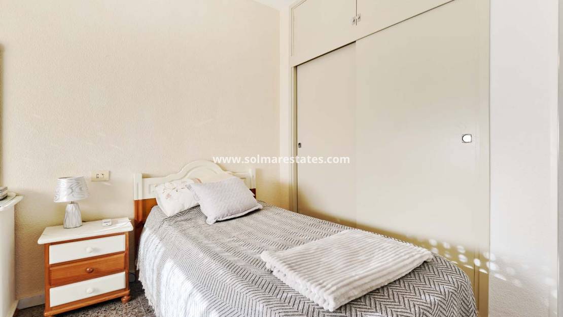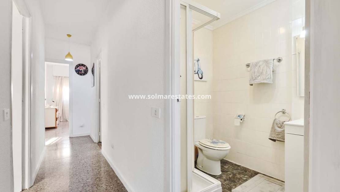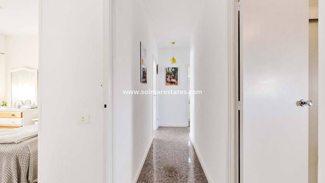 El apartamento se encuentra en la segunda planta. Al cruzar la puerta principal, un pasillo de entrada conduce a un dormitorio doble a la derecha, actualmente utilizado como segundo salón, y a un segundo dormitorio doble a la izquierda con armarios empotrados y aire acondicionado. Más adelante en el pasillo se encuentra el dormitorio principal, también con aire acondicionado y armarios empotrados. Una puerta oculta dentro del armario da acceso al baño en suite, también accesible desde el pasillo. Junto a él se encuentra el segundo baño, también con ducha.