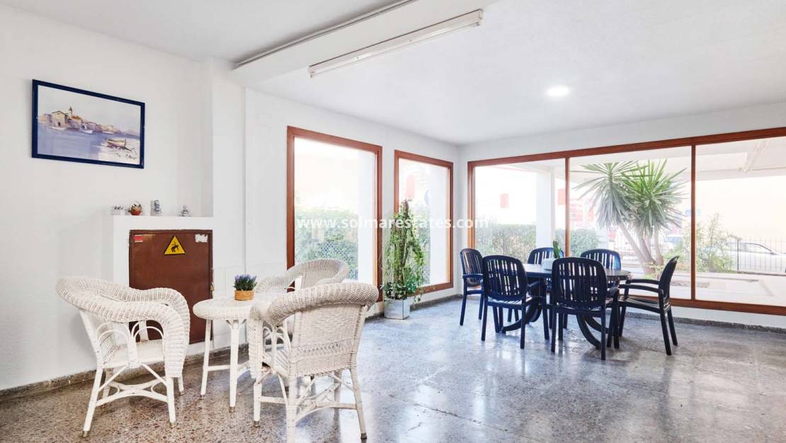 Al entrar a la zona común, hay una gran terraza cubierta con asientos, ideal para relajarse a la sombra y socializar con los vecinos. La planta baja también ofrece dos zonas de estar interiores adicionales y acceso en ascensor al sótano, la primera y la segunda planta.
