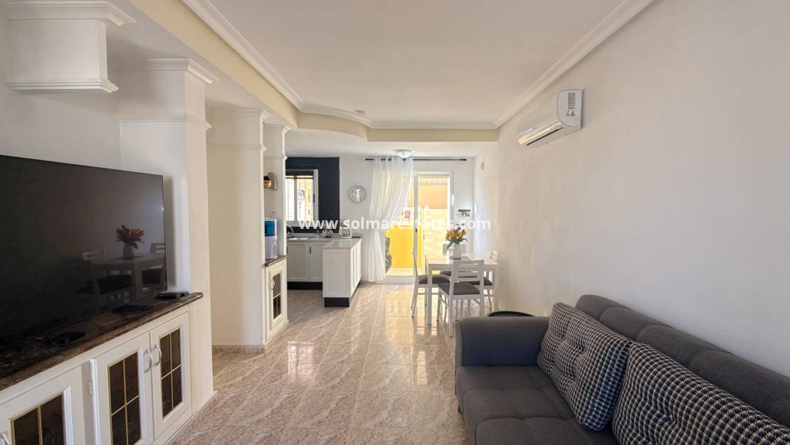 La propiedad ha sido recientemente renovada e incluye una cocina moderna y dos baños recién equipados. Para mayor privacidad, se ha construido un muro elevado en la parte delantera del jardín, que también cuenta con una encantadora sala de estar y una terraza que da al salón. También se ha instalado un práctico baño con ducha en la planta baja. El salón tiene espacio suficiente para una mesa de comedor y sillas, e incluye una cocina americana y un nuevo equipo de aire acondicionado frío-calor.