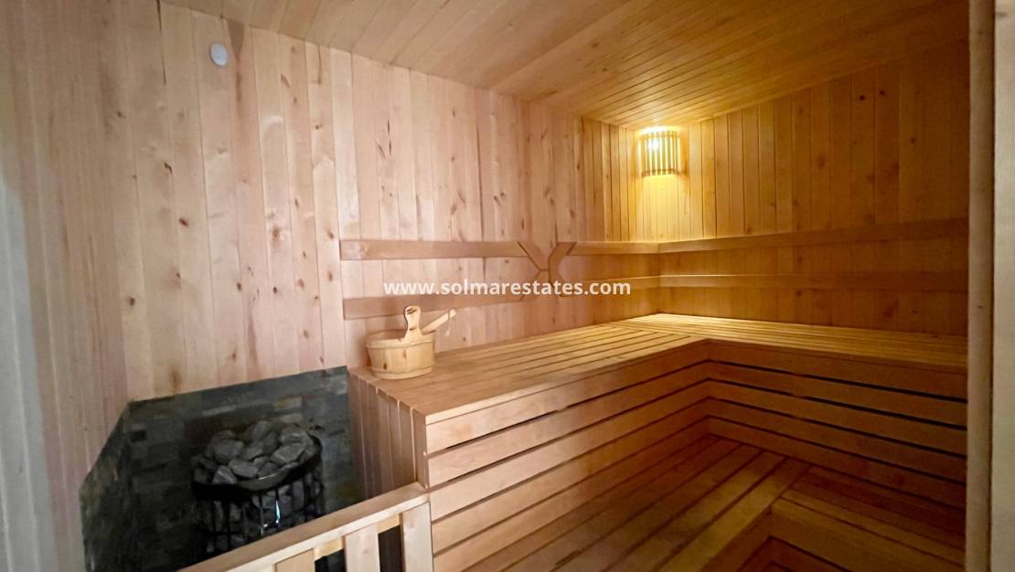 Las características adicionales incluyen acceso adaptado para personas con movilidad reducida (PMR) , aire acondicionado central y un moderno ascensor . Los residentes también pueden disfrutar de una sauna , ideal para relajarse, además de acceso a un solárium comunitario con zona de barbacoa y atractivas vistas al mar .