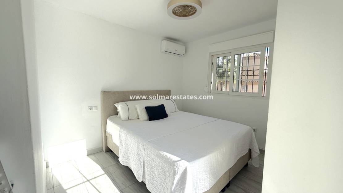 Ambos dormitorios cuentan con armarios empotrados y aire acondicionado, y el dormitorio principal tiene acceso a un balcón con vistas a la piscina. El solárium de la planta superior, con césped artificial, ofrece fantásticas vistas de los alrededores e incluso se puede vislumbrar el mar, a solo 10 minutos a pie.