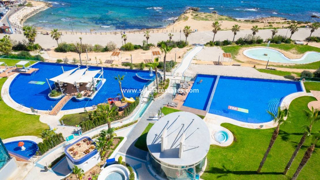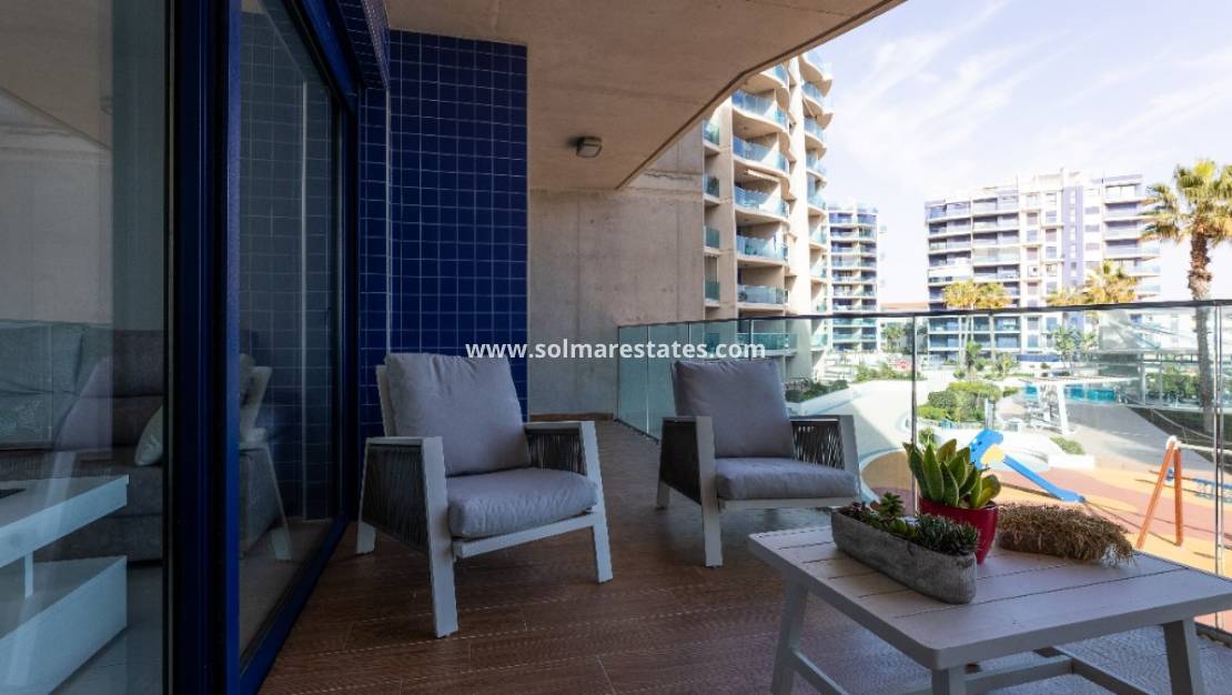 Esta espaciosa propiedad ofrece dos dormitorios, dos baños, una cocina totalmente equipada con barra americana, lavadero y un luminoso salón. El apartamento cuenta con dos terrazas: una con vistas panorámicas al mar y a las zonas comunes, y otra con vistas a los alrededores.