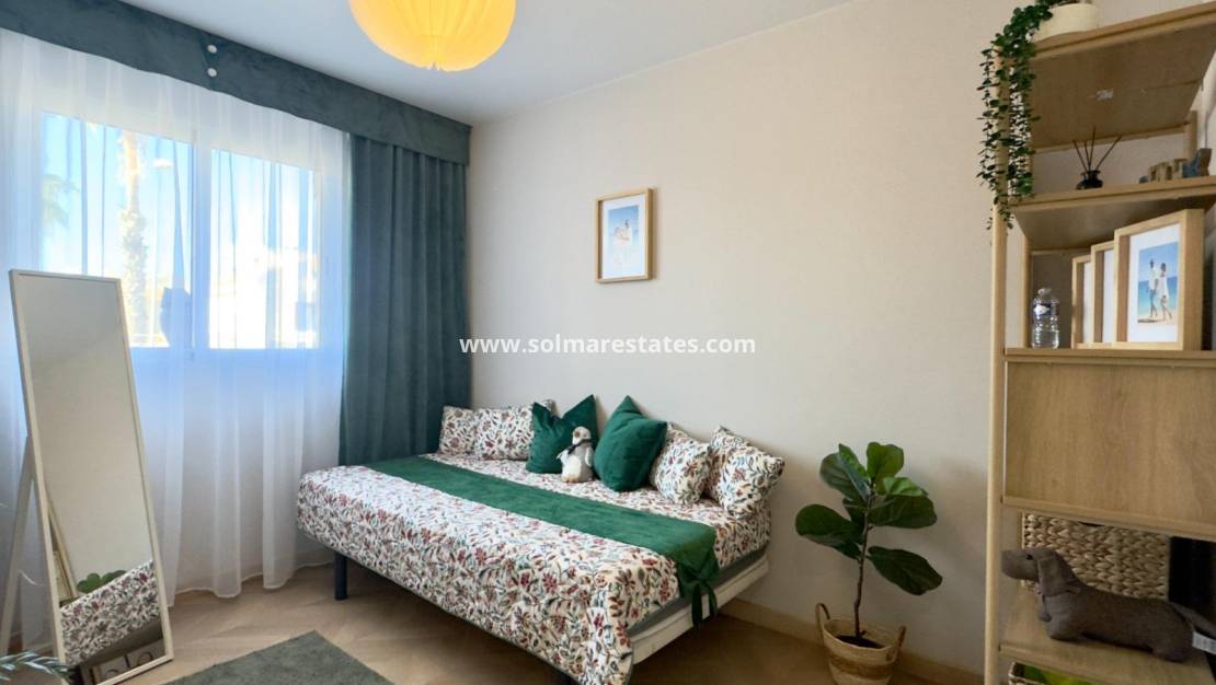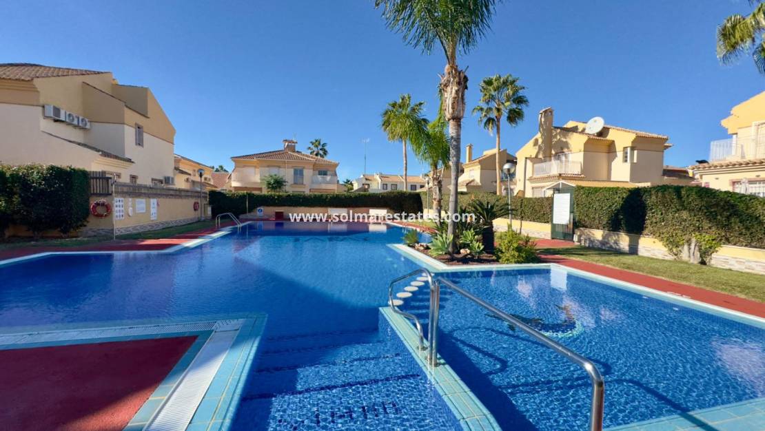 La parcela mide 98,45 m² y ofrece un espacio exterior privado ideal para relajarse o disfrutar de una cena al aire libre. El complejo residencial cuenta con una piscina comunitaria bien cuidada, rodeada de zonas verdes, ideal para el ocio y la relajación. El precio incluye una plaza de aparcamiento privada (número 9).