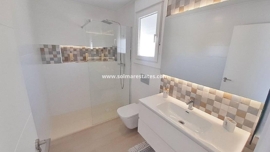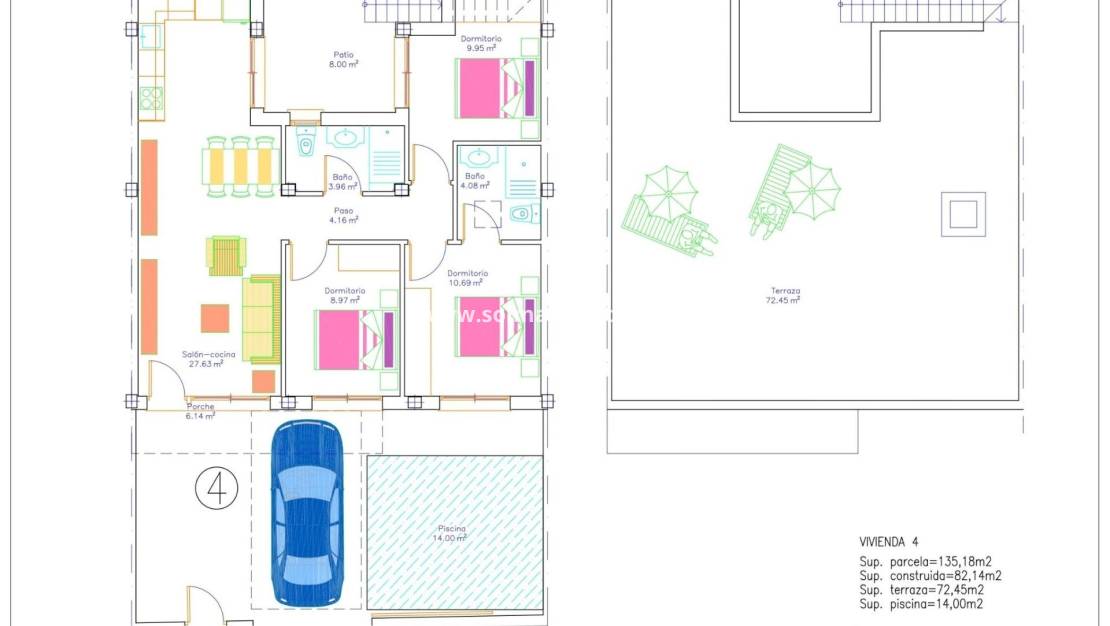 Casas adosadas de nueva construcción con piscina privada en Avileses, Murcia Modernas viviendas de una sola planta en una tranquila ubicación de Murcia Esta nueva promoción residencial consta de cinco casas adosadas de estilo contemporáneo situadas en Avileses, un pueblo tradicional español de la región de Murcia. Conocido por su ambiente relajado y su encanto local, Avileses ofrece servicios diarios, instalaciones deportivas y un auténtico estilo de vida mediterráneo, sin dejar de estar cerca de campos de golf, playas y las principales conexiones de transporte. La zona es ideal para vivir de forma permanente, pasar las vacaciones o invertir, gracias a su excelente relación calidad-precio y a la creciente demanda. Distribución bien pensada, diseñada para disfrutar de la vida al aire libre Todas las viviendas son de una sola planta y han sido diseñadas para disfrutar del sol durante todo el año. Cada propiedad cuenta con una terraza delantera, un patio trasero privado y un amplio solárium en la azotea, lo que crea múltiples zonas al aire libre para relajarse y divertirse. El jardín privado incluye una piscina y aparcamiento en la parcela, lo que garantiza la comodidad y la privacidad de todos los propietarios. En el interior, las viviendas ofrecen una distribución práctica y luminosa con tres dormitorios y dos baños, incluido un dormitorio principal con baño en suite. El diseño abierto y funcional potencia la luz natural y crea un ambiente acogedor, ideal tanto para familias como para parejas. Especificaciones de alta calidad y comodidad moderna Estas casas adosadas de nueva construcción se entregan con acabados de alta calidad e instalaciones modernas. Las cocinas están completamente amuebladas y equipadas con electrodomésticos Balay, incluyendo vitrocerámica, horno, microondas, campana extractora, frigorífico integrado y lavavajillas integrado. Los baños están completamente equipados con inodoros suspendidos, tocadores, espejos, columnas de ducha de lluvia y mamparas de ducha. Otras características adicionales son las persianas motorizadas en las ventanas frontales, los armarios empotrados con cajones, la iluminación interior LED en la cocina, la sala de estar, el pasillo y los baños, y la iluminación LED integrada en las paredes del jardín y el solárium. El agua caliente se produce mediante un sistema aerotérmico y se incluye la preinstalación de aire acondicionado por conductos para garantizar el confort durante todo el año. Excelente ubicación cerca de campos de golf, playas y aeropuerto Avileses está rodeado de varios campos de golf de renombre, lo que lo convierte en una excelente opción para los amantes de este deporte. La Torre Golf Resort se encuentra a unos 6 km y Hacienda Riquelme Golf, a unos 7 km de la urbanización. El Mar Menor y las playas del Mediterráneo se encuentran a unos 15 km y ofrecen una amplia gama de deportes acuáticos y actividades de ocio. El aeropuerto internacional de Murcia está a solo 20 km, mientras que la ciudad de Murcia se encuentra a unos 25 km, donde se puede disfrutar de tiendas, cultura y gastronomía. Una inversión inteligente en la Costa Cálida Con un diseño moderno, piscinas privadas y una excelente ubicación cerca de campos de golf y playas, estas casas adosadas de nueva construcción en Avileses ofrecen un valor excepcional y un gran potencial de estilo de vida. Póngase en contacto con nosotros hoy mismo para recibir más información o concertar una visita y asegurarse su nueva vivienda en Murcia.
