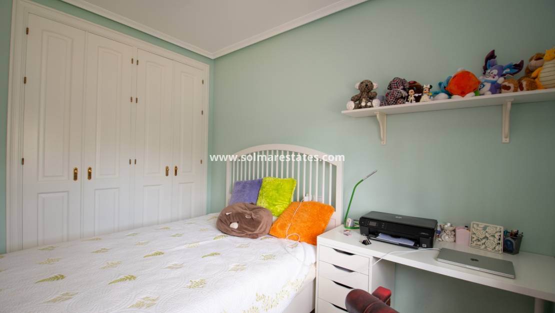 La planta superior consta de tres dormitorios adicionales y dos baños. La suite principal cuenta con armarios empotrados, un baño con ducha y jacuzzi y acceso directo a una terraza privada con vistas al campo de golf. Otros dos dormitorios dobles, ambos con armarios empotrados, comparten otra terraza solárium, lo que garantiza que todos los dormitorios disfruten de luz natural y acceso al exterior. Un baño familiar con ducha da servicio a estos dormitorios.