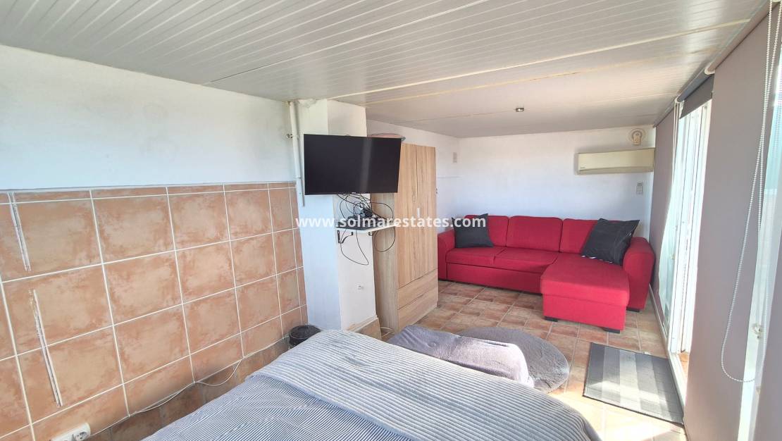 En la planta superior, la propiedad se despliega con un espacioso solárium privado , ideal para tomar el sol, entretenerse o simplemente relajarse al aire libre. Esta planta también cuenta con una amplia habitación adicional , actualmente utilizada como tercer dormitorio con zona de estar y baño con ducha , lo que ofrece un alojamiento versátil, perfecto para invitados o familias numerosas.