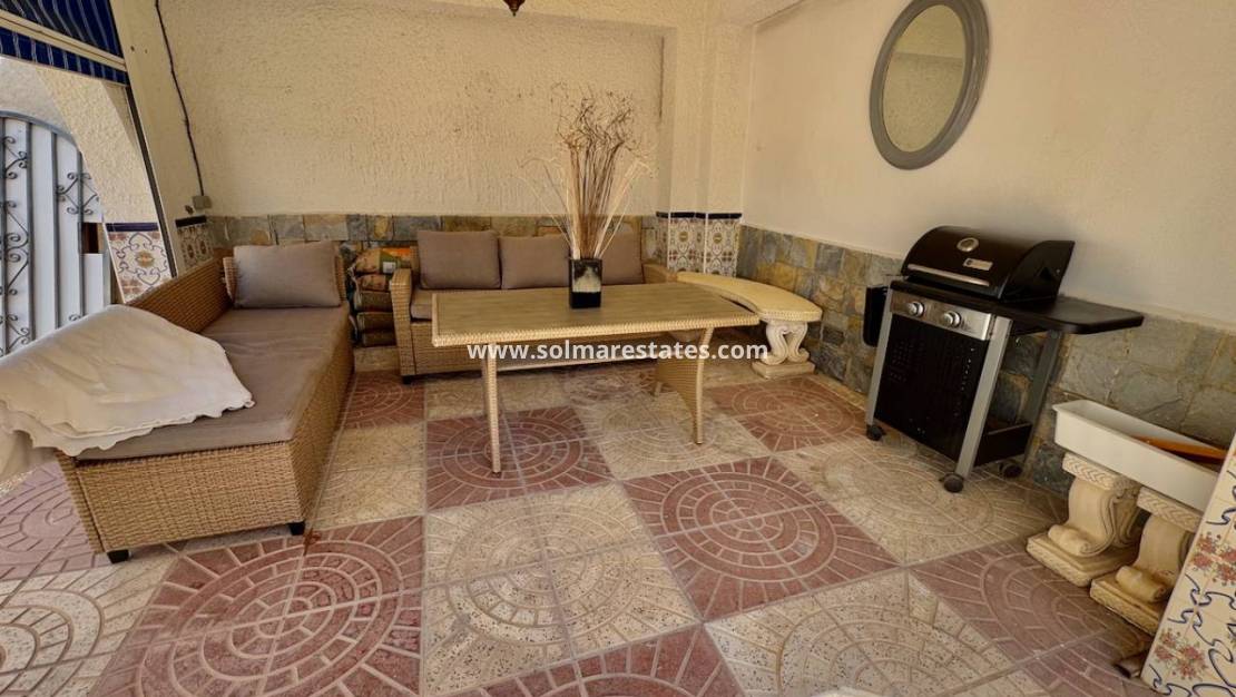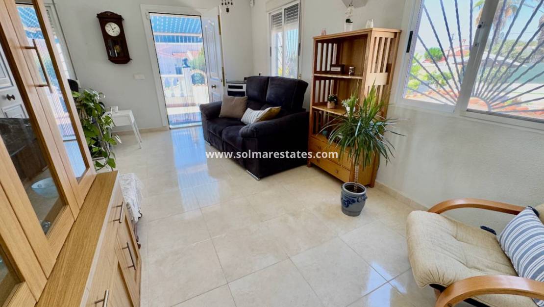 Ubicada en una generosa parcela de 500 m² con orientación sur, la propiedad ofrece aproximadamente 120 m² de superficie construida y disfruta de abundante sol durante todo el día. La villa cuenta con tres amplios dormitorios con armarios empotrados y tres baños completos, ideal tanto para familias como para recibir invitados. Una cocina independiente totalmente equipada con electrodomésticos modernos completa la distribución interior.