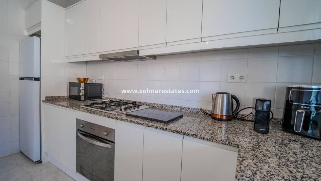 Una cocina práctica y bien diseñada con amplio espacio de almacenamiento y acceso directo a las áreas de estar principales.