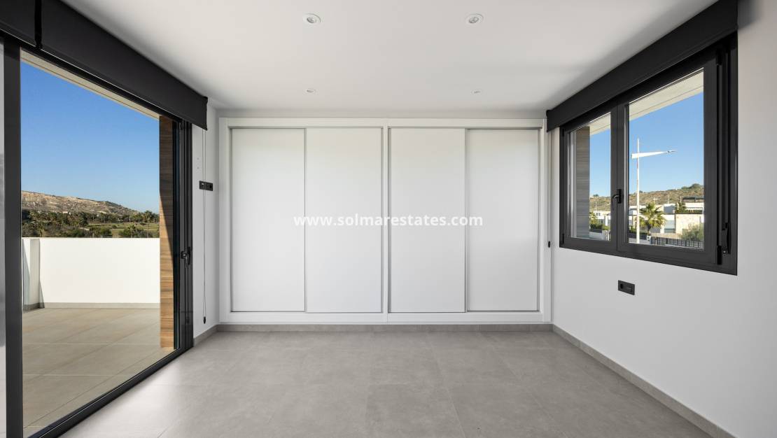 Tres dormitorios se encuentran en la planta principal, uno de ellos con baño en suite, y dos de ellos con acceso directo a la terraza de la piscina. La planta superior alberga la suite principal, con baño privado y puertas correderas que dan a un solárium envolvente con vistas panorámicas al campo de golf y a la montaña.