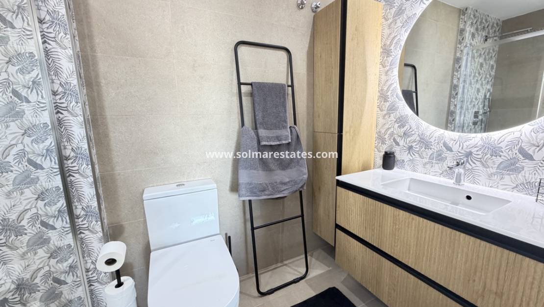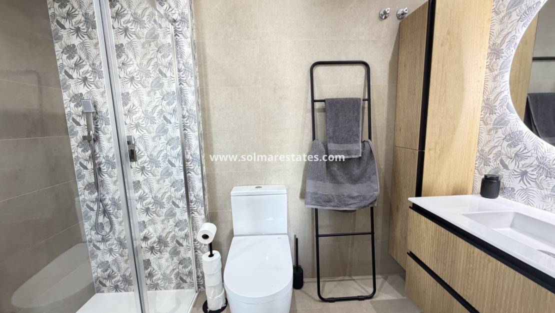 La planta baja también cuenta con un amplio dormitorio de invitados con armarios empotrados y un moderno baño familiar con acabados de alta gama. En la planta superior, la impresionante suite principal cuenta con un elegante baño en suite, una terraza acristalada con cortinas de cristal plegables y un vestidor. Desde la suite principal, se accede a una amplia terraza orientada al sur con zona para tomar el sol y jacuzzi privado, ideal para relajarse o disfrutar del clima mediterráneo.