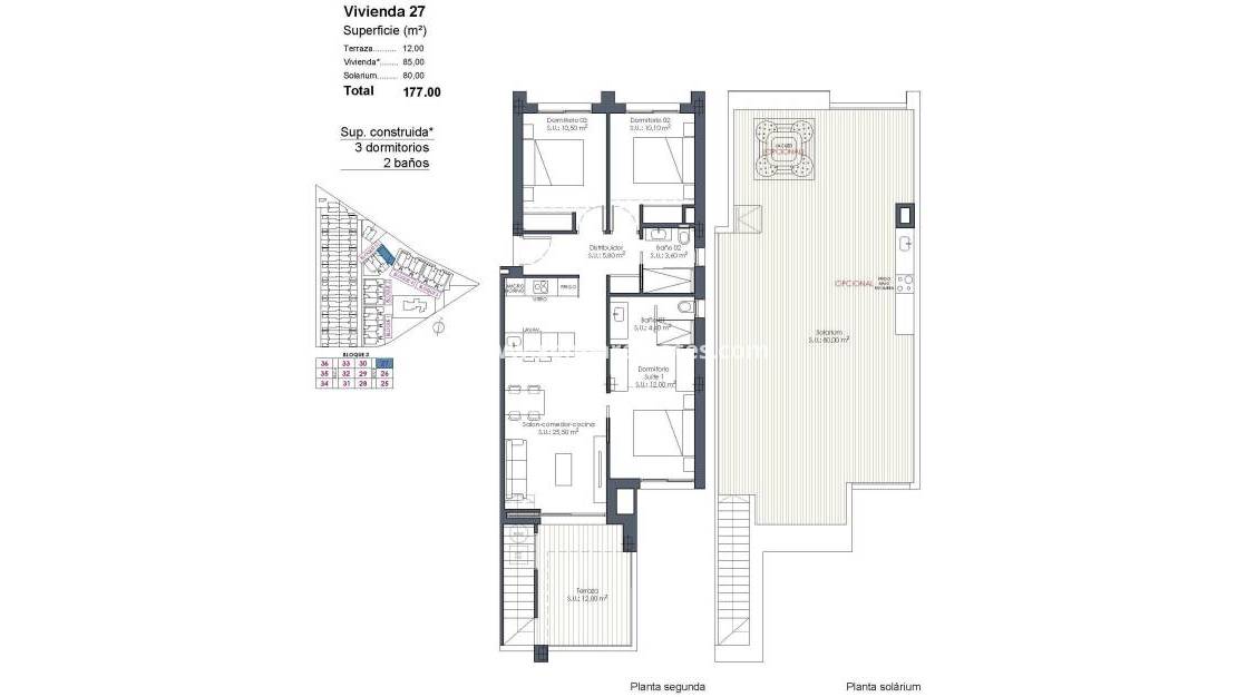 Apartamentos de nueva construcción en La Serena Golf-Los Alcázares, cerca de la playa Vida moderna frente al campo de golf en la Costa Cálida Descubra este exclusivo complejo residencial de nueva construcción situado en La Serena Golf, en Los Alcázares. Esta urbanización contemporánea cuenta con 66 elegantes apartamentos de 2 o 3 dormitorios y 2 baños, uno de ellos en suite, diseñados para ofrecer comodidad, elegancia y un excepcional estilo de vida mediterráneo a solo 300 metros del Mar Menor. Los Alcázares es una encantadora localidad costera conocida por su ambiente relajado, sus playas de arena y su largo paseo marítimo. Con más de 300 días de sol al año, la zona ofrece un entorno perfecto para la vida al aire libre, los deportes acuáticos y el golf. La localidad también cuenta con una amplia selección de restaurantes, tiendas, puertos deportivos e instalaciones deportivas, lo que la convierte en un destino muy deseable tanto para la residencia permanente como para las vacaciones. Apartamentos con terrazas, jardines y soláriums privados El complejo residencial ofrece varios tipos de propiedades que se adaptan a diferentes estilos de vida. Los compradores pueden elegir entre apartamentos en planta baja con jardines privados, viviendas en plantas intermedias con amplias terrazas o áticos con terrazas y grandes soláriums en la azotea. Los soláriums incluyen una ducha exterior y ofrecen la opción de añadir una cocina de verano y un jacuzzi privado, creando un espacio ideal para relajarse y divertirse mientras se disfruta de las vistas abiertas al campo de golf y al paisaje circundante. Cada vivienda ha sido diseñada con interiores luminosos y espacios diáfanos que conectan a la perfección con las zonas exteriores. Servicios estilo resort y zonas comunes excepcionales Una de las características más distintivas de esta promoción es su concepto de estilo resort. Los residentes pueden disfrutar de una espectacular piscina estilo laguna de aproximadamente 190 m2 con acceso estilo playa y zonas de relax con camas balinesas. Las instalaciones comunes adicionales incluyen jardines paisajísticos, una zona de spa, gimnasio y sauna situados en el sótano. El complejo también ofrece un parque infantil, dos pistas de petanca y aseos comunes cerca de la zona de la piscina, creando un ambiente acogedor para los residentes y los invitados. Acabados de calidad y características modernas Los apartamentos están construidos con materiales modernos y especificaciones de alta calidad diseñadas para ofrecer comodidad y estilo. Cocina totalmente equipada con electrodomésticos de acabado en cristal blanco Baños con tocadores, mamparas de ducha y espejos retroiluminados Persianas motorizadas Paquete de iluminación básico Aire acondicionado por conductos totalmente instalado Plaza de aparcamiento subterráneo para cada propiedad Aparcamiento subterráneo para bicicletas y trasteros opcionales Ubicación privilegiada cerca de la playa y el golf Playa del Mar Menor a 0,3 km Golf La Serena junto a la urbanización Centro de Los Alcázares a 2 km Cartagena a 22 km Murcia a 40 km Aeropuerto Internacional de la Región de Murcia a 30 km Aeropuerto de Alicante-Elche a 90 km Las tranquilas y poco profundas aguas del Mar Menor son ideales para nadar, navegar y practicar paddle surf durante todo el año. Asegure su vivienda en La Serena Golf Resort Estos modernos apartamentos combinan la vida junto a la playa, vistas al campo de golf desde la mayoría de las unidades y comodidades estilo resort en una de las zonas más atractivas de la Costa Cálida. Póngase en contacto con nosotros hoy mismo para recibir más información o concertar una visita y asegurar su nueva vivienda en La Serena Golf-Los Alcázares.