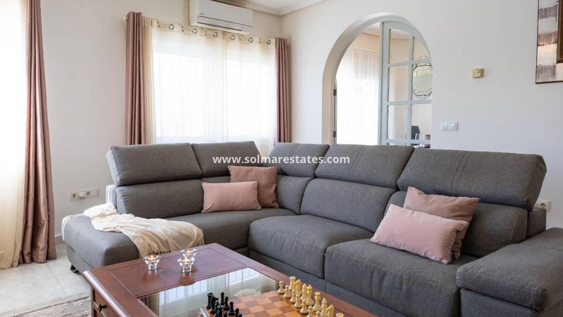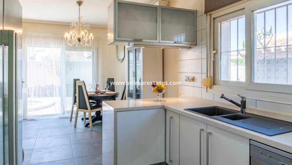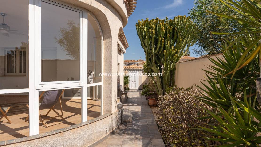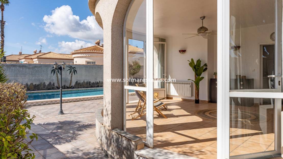 Esta villa independiente en perfecto estado y magníficamente ubicada en el corazón de Playa Flamenca se encuentra realmente cerca de todo a pie: Supermercados, zonas deportivas municipales, zonas deportivas privadas, centro comercial Zenia Boulevard; colegio público, Ayuntamiento, tiendas, médicos y las playas de Orihuela Costa. ~El mercado del sábado está en la misma calle de la propiedad con acceso directo para poder disfrutar de las compras de frutas, verduras y productos tradicionales y con el ambiente de vivir en un pequeño pueblo español. ~~El tamaño de la parcela de esta vivienda es de 525 m2 con multitud de posibilidades para disfrutar del espacio exterior de la vivienda, con zona de piscina, barbacoa, solarium, pérgolas, aparcamiento.... y de muy fácil mantenimiento, con terrazas, césped artificial y zonas de grava para que no tenga un excesivo trabajo el tener su jardín y zonas exteriores de la parcela en perfecto estado y cuenta con un cuarto de acceso exterior junto a la zona de barbacoa y terrazas para poder utilizarlo sin necesidad de entrar a la vivienda cuando se está disfrutando de la piscina.~El aparcamiento dentro de su misma parcela, con puertas automáticas de acceso para vehículos y con garaje-trastero propio para mantener su vehículo protegido del sol Alicantino mientras que su zona de la piscina es perfecta para tomar el sol con privacidad al mismo tiempo que su barbacoa de obra y su pérgola de madera permite utilizar todo el potencial de la parcela al tener orientación Sur y sol prácticamente todo el día así como tener luminosidad en toda la zona de uso diurno de la propiedad. ~~Cuenta con una terraza solarium acristalada a la entrada de la vivienda, pero con su tejado de teja árabe, con lo que en invierno al tener el sol más bajo puede utilizarlo para tomar el sol y en verano abriendo las hojas de las ventanas de cristal y tener la sombra de su tejado es una zona fresca y ventilada donde poder disfrutar de la lectura y estar con la familia en un espacio semiexterior cubierto.~Desde esta terraza cubierta con arcos, se accede tanto a la zona de garaje como a la vivienda propiamente dicha, por lo que al llegar con bolsas de compras desde el vehículo se llega directamente a la vivienda haciendo más cómodo su acceso.~A través del hall de entrada se llega al salón, con chimenea eléctrica y ventanas orientadas al Sur para mayor claridad y sol en el mismo, y se entra a la zona de cocina comedor independiente, con puertas de separación para poder cocinar sin que entren olores y humos al resto de la vivienda.~La cocina tiene puertas balconeras de salida directamente a la zona de piscina y terrazas para mayor comodidad y hacer la vida en el exterior de la vivienda, y tiene muebles de cocina y electrodomésticos.~La vivienda cuenta con tres dormitorios amplios, con armarios empotrados, un cuarto de baño con ducha de obra y otro cuarto de baño completo on suite con ducha de obra y jakuzzy para uso de la habitación principal. ~~En resumen, se trata de un chalet independiente en una zona céntrica y estupendamente comunicada, con zonas exteriores para ocio y disfrute de su familia y en perfecto estado y listo para entrar a vivir en ella, merece la pena una visita para poder comprobar tan estupendas características. ~~Precio: 585.000€ Impuestos y gastos de compraventa No incluidos (según Normativa aplicable). Se informará del desglose de gastos adicionales antes de la reserva.~En caso de operación con doble mediación, los honorarios profesionales a cargo del comprador serán del 1,5 % del precio final de compraventa, con un mínimo de 3.000 €, más IVA (21 %), salvo pacto expreso en contrario. Dichos honorarios no están incluidos en el precio anunciado