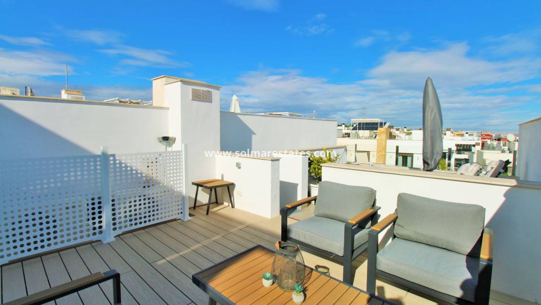 En la planta superior, dos habitaciones dobles cuentan con armarios empotrados y baño privado. Una de las habitaciones también dispone de una terraza privada, que ofrece espacio adicional al aire libre. Una escalera exterior conduce a un solárium privado en la azotea, ideal para tomar el sol, relajarse o disfrutar de comidas al aire libre durante todo el año.