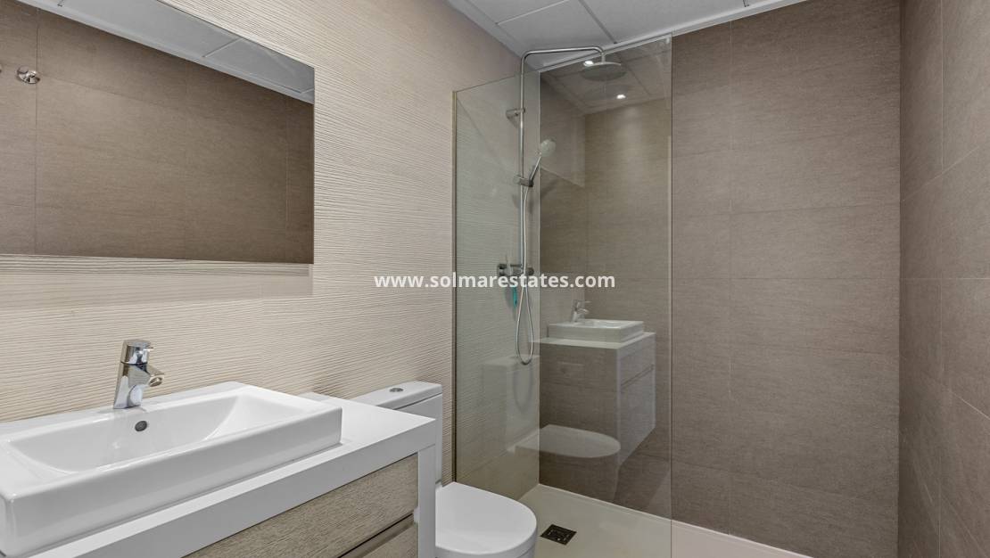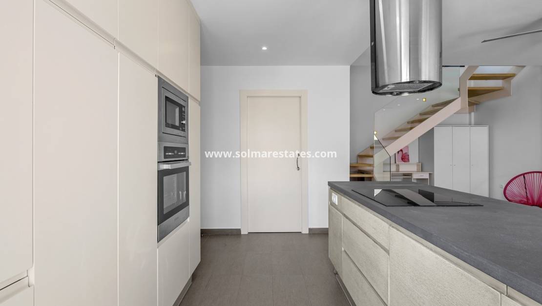 La primera planta consta de dos dormitorios dobles y un segundo baño completo. El dormitorio principal tiene acceso a un balcón privado, al igual que el dormitorio de invitados. Desde aquí, unas escaleras conducen a un impresionante solárium privado, uno de los elementos más destacados de la propiedad, que ofrece vistas panorámicas y un entorno perfecto para relajarse, tomar el sol o disfrutar de una comida al aire libre.