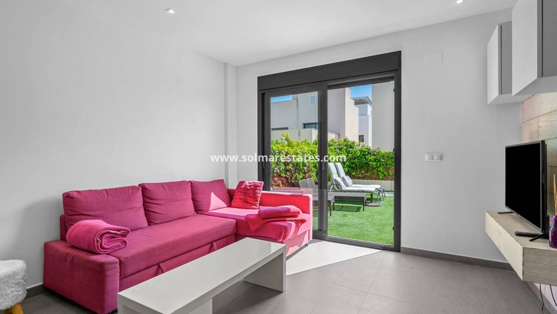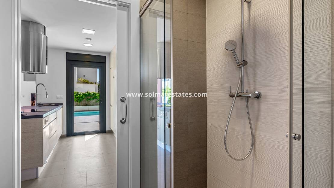 En la planta baja, la villa ofrece una distribución moderna de planta abierta, con una cocina totalmente equipada conectada a una sala de estar amplia y luminosa. Esta planta es ideal tanto para el día a día como para recibir invitados, e incluye además un baño completo.