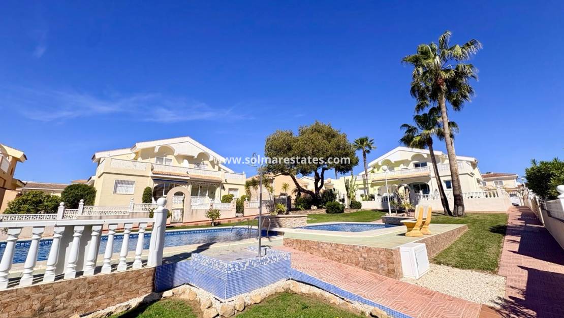 El jardín privado da acceso a la zona comunitaria con piscina, perfecta para refrescarse en los cálidos días de la Costa Blanca. El porche cubierto ofrece un espacio extra muy práctico y cómodo.