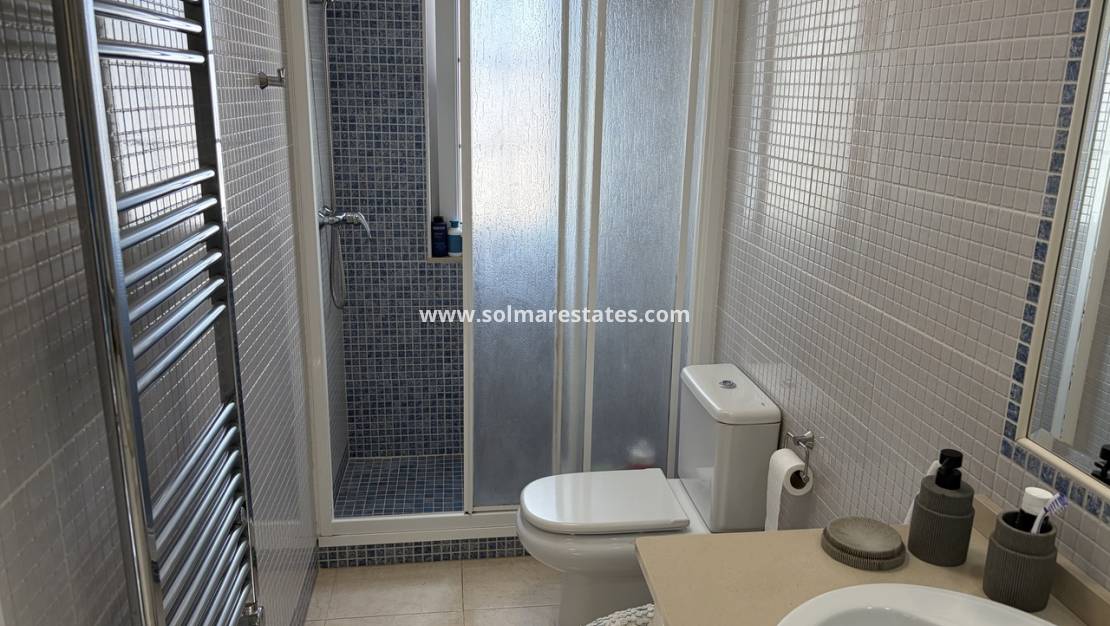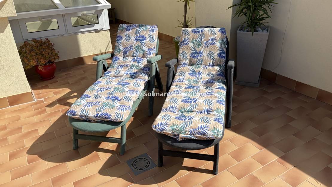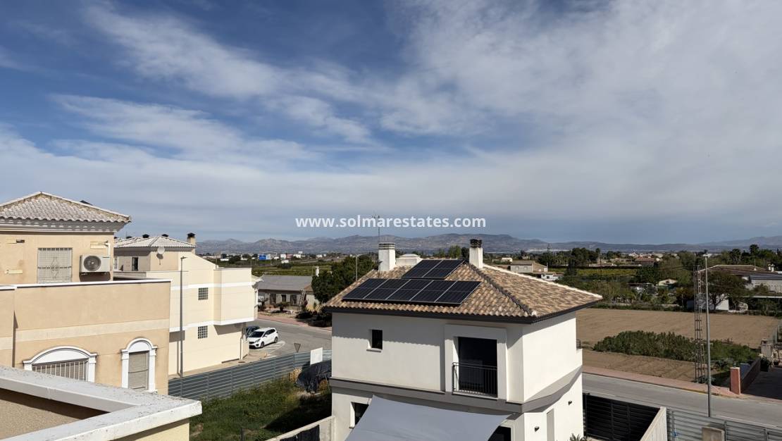 La primera planta cuenta con dos amplios dormitorios dobles, incluyendo el principal con baño privado y un balcón francés orientado al sur con acceso a la terraza. En la planta superior, un tercer dormitorio da a un solárium privado con vistas panorámicas al campo y las montañas circundantes, ideal para relajarse bajo el sol.