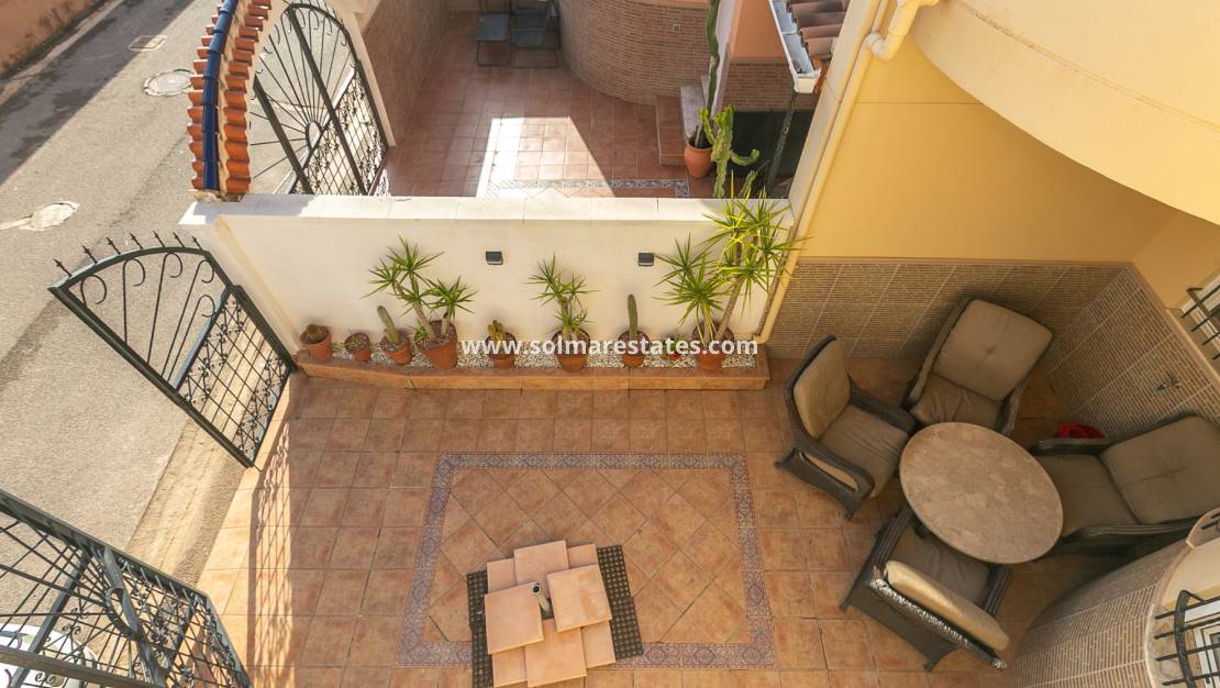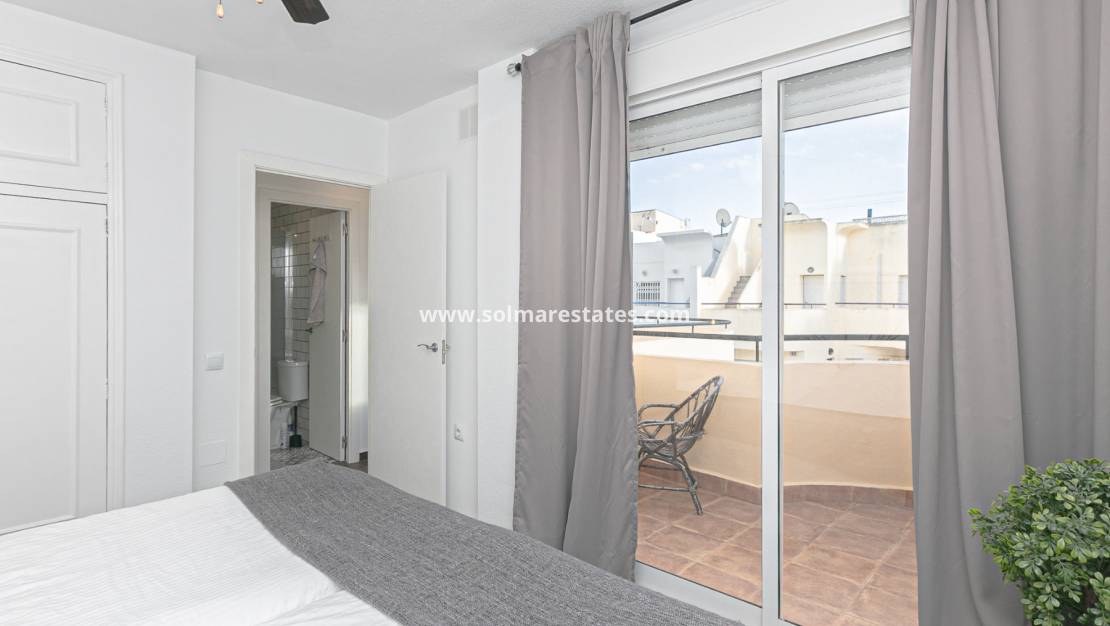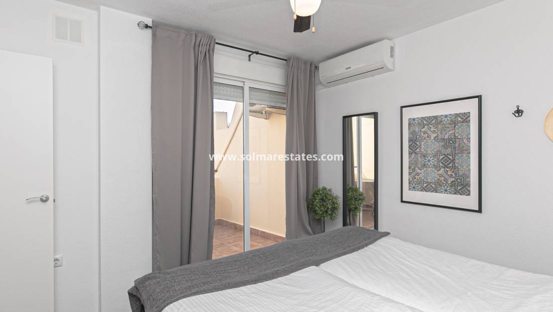 En la planta superior, encontrará el espacioso dormitorio principal, un baño familiar reformado con ducha y acceso a una terraza privada. Desde aquí, unas escaleras conducen al solárium de la azotea, que incluye una ducha exterior y espacio de almacenamiento adicional: un lugar ideal para relajarse y disfrutar del sol mediterráneo.