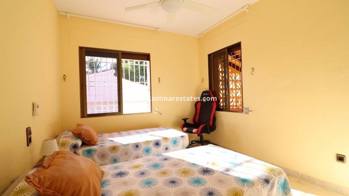 Cabo Roig, Villa individuelle au coin de deux rues avec un terrain de 522 m2 et une orientation sud-est, et à seulement 300 mètres de la plage de Capitan, avec une maison à deux étages de 276 m2, la maison dispose de 5 chambres, 2 salles de bain complètes, salon de 60m2 avec cheminée, grande cuisine indépendante, piscine 8x3 avec coin barbecue, grande terrasse devant la maison, vendue meublée et avec climatisation et chauffage. Garage pour 2 voitures avec pergola.~