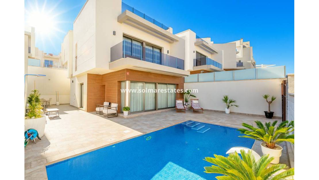 Le rez-de-chaussée comprend un salon-salle à manger lumineux et aéré avec une cuisine moderne sur mesure avec des appareils intégrés (four, micro-ondes, lave-vaisselle, réfrigérateur-congélateur...), une chambre en bas avec placards intégrés (actuellement utilisée comme bureau/2ème salon) et une salle de bain en bas avec douche à l'italienne. De grandes portes coulissantes du salon vous mènent directement à la piscine. A l'étage, il y a 2 chambres doubles avec placards intégrés, toutes deux offrant des salles de bains privatives avec douches à l'italienne, ainsi qu'un accès au balcon avant. Depuis le palier, vous pouvez accéder à l'immense solarium sur le toit, offrant une vue imprenable sur les lacs salés de Torrevieja, la mer et les environs. La propriété est vendue avec des meubles de haute qualité, des appareils électroménagers et bénéficie d'autres extras, notamment le chauffage au sol dans toutes les salles de bains, la climatisation canalisée dans tout l'appartement, des stores électriques, un éclairage LED et un panneau solaire pour l'eau chaude.
