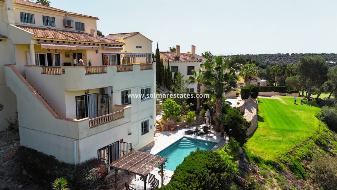 Villa impeccable à vendre, bénéficiant d'une vue dominante en première ligne de golf, au sein du complexe de golf Las Ramblas. Cette impressionnante propriété exposée plein sud a été conçue pour que chaque pièce offre une vue spectaculaire sur le golf et la pinède. Au rez-de-chaussée se trouve un vaste salon avec télévision et salle à manger séparées, ainsi que des toilettes invités. La superbe cuisine entièrement équipée avec plafond voûté et un escalier menant à un espace détente supplémentaire et à un bureau privé. Depuis le salon, on accède à une terrasse très ensoleillée, un barbecue et un coin repas extérieur offrant une vue imprenable sur le golf. Un escalier intérieur mène à la chambre principale, dotée d'une terrasse privée, d'un dressing et d'une salle de bains double avec douche et baignoire. Deux autres chambres d'amis et une salle de bains sont également disponibles. La propriété dispose également d'un deuxième salon avec cuisine, salle de bains et même d'un bar à cocktails avec accès direct à la piscine et à la terrasse. La propriété a été finie avec une haute qualité et dotée de nombreux extras, notamment un garage privé, la climatisation, deux cheminées, des moustiquaires, des portails électriques et un système d'alarme.