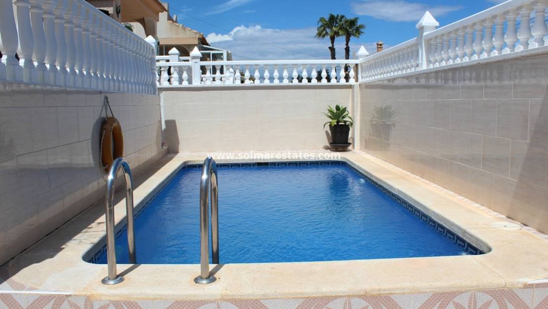 PRÊTE À EMMÉNAGER ! Cette magnifique villa individuelle de 103 m², comprenant 3 chambres et 2 salles de bains, est située à BLUE LAGOON, à SAN MIGUEL DE SALINAS, sur un terrain de 200 m² avec une piscine privée de 12 m² et plusieurs terrasses ensoleillées. Au rez-de-chaussée, vous trouverez 2 chambres doubles, une salle de bains rénovée, une cuisine ouverte entièrement équipée, un grand salon/salle à manger et un débarras. Un escalier extérieur vous mènera au 1er étage, où vous trouverez un spacieux studio indépendant comprenant une chambre, une salle de douche séparée, une kitchenette et un salon donnant sur une grande terrasse avec barbecue et une vue magnifique ! Au 2e étage, une autre grande terrasse sur le toit, équipée d'un panneau solaire pour l'eau chaude, offre une vue imprenable sur la mer et les lacs salés ! La propriété est située dans un quartier très calme et ensoleillé, à quelques pas de toutes les commodités : supermarchés (Mercadona et Aldi), restaurants et bars, nouvelle piscine publique, « Green Lands », minigolf, école internationale El Limonar, et à proximité immédiate de la célèbre Plaza de Villamartin et du centre commercial La Fuente. Les magnifiques plages d'Orihuela Costa sont à seulement 4 km et le célèbre centre commercial Zenia Boulevard, avec ses plus de 150 boutiques, bars et restaurants, est à quelques minutes en voiture.
