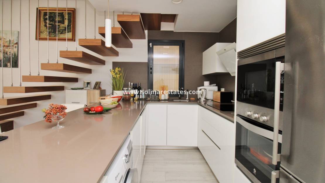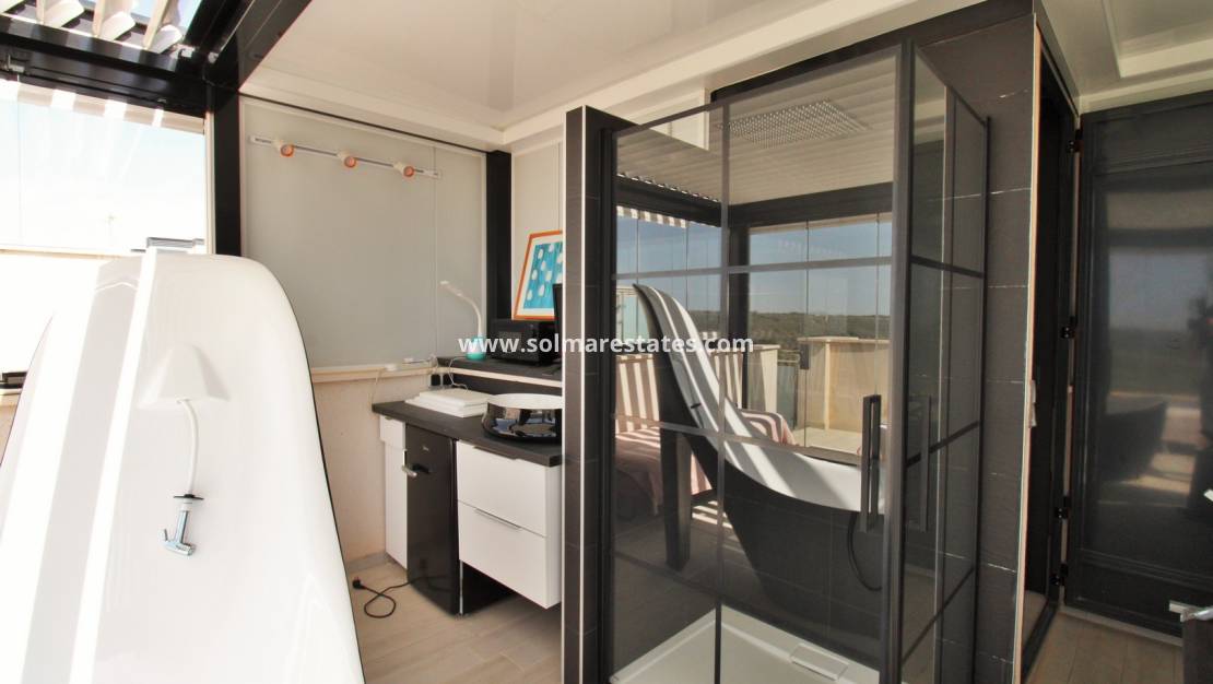 Cette superbe villa individuelle de trois chambres et trois salles de bains est située dans le très recherché développement Palm Beach II à Lomas de Cabo Roig , à seulement 2 km des magnifiques plages Pavillon Bleu d' Aguamarina et de La Glea (Campoamor) .