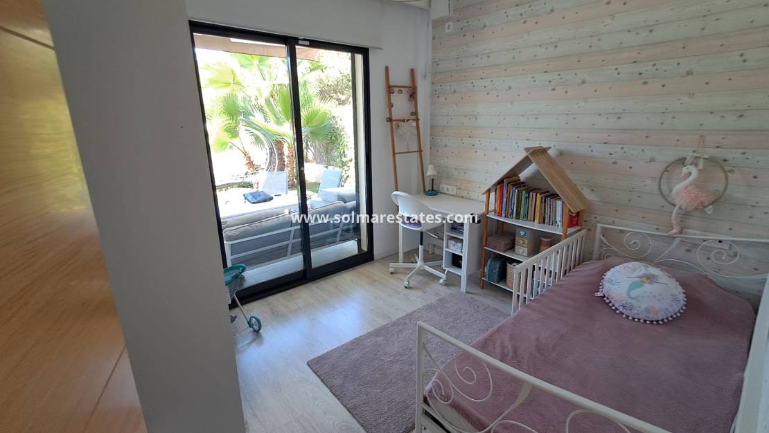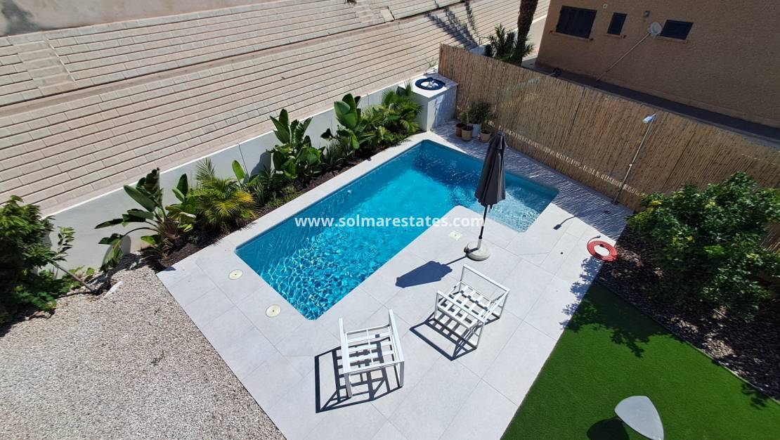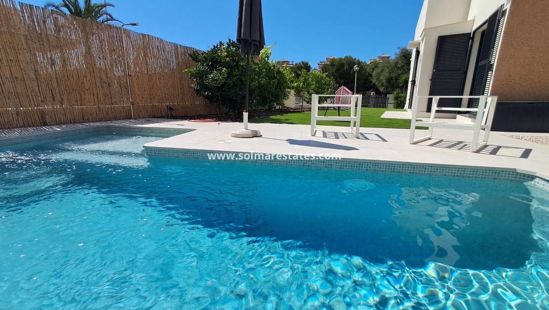 La villa dispose d'une piscine privée nichée dans un élégant jardin facile d'entretien, agrémenté de gazon artificiel, idéal pour se détendre, recevoir ou profiter du soleil espagnol. Un grand solarium sur le toit offre encore plus d'espace pour profiter du climat méditerranéen et admirer la vue panoramique.