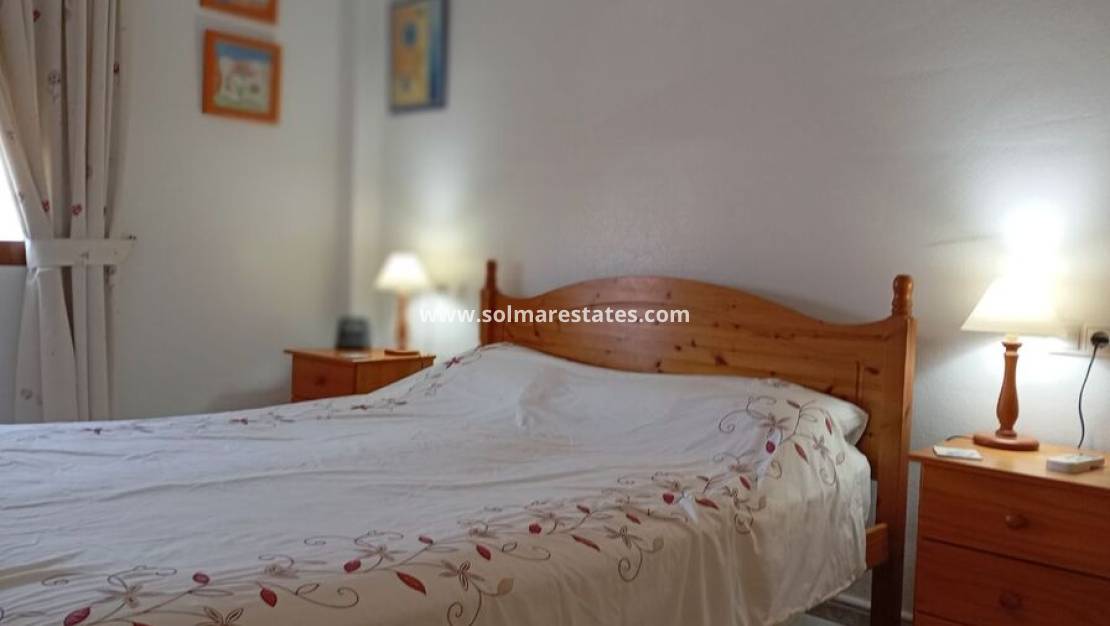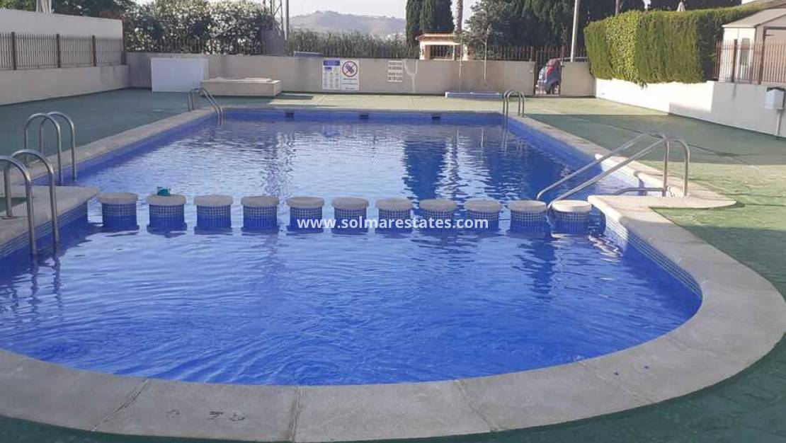 Cet appartement d'angle, plus spacieux que la moyenne, situé au dernier étage, bénéficie d'un emplacement unique, juste à côté de la piscine commune. Il comprend deux chambres doubles, un très grand salon/salle à manger, une cuisine ouverte et une salle de bain complète. Les portes-fenêtres s'ouvrent sur une grande terrasse, avec un escalier extérieur menant à un immense solarium avec barbecue intégré et une belle vue sur les environs, idéal pour bronzer toute la journée.