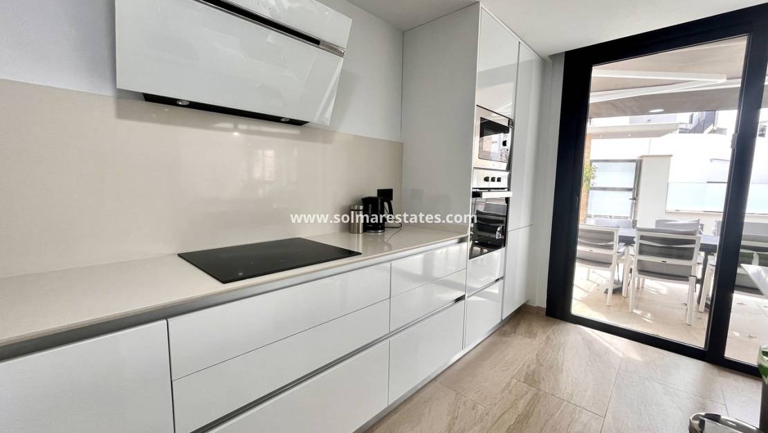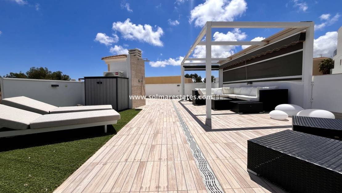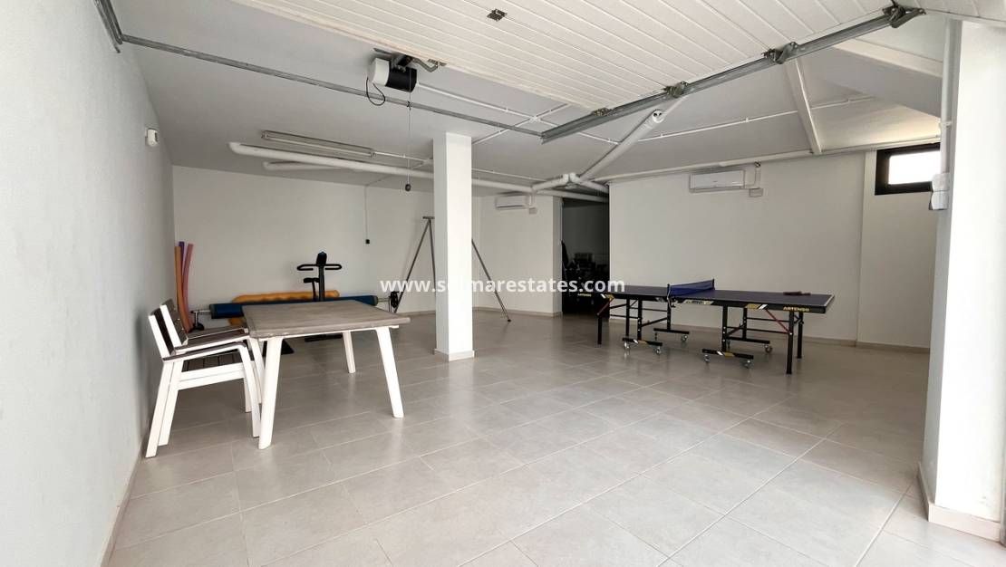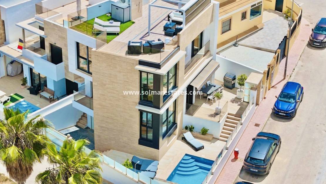 La propriété dispose d'un salon/salle à manger lumineux et spacieux, d'une cuisine ouverte moderne entièrement équipée, de trois chambres avec placards, de trois salles de bains, de la climatisation (chaud/froid) partout, d'un éclairage LED, d'un grand jardin avec piscine privée, d'une terrasse/solarium privée sur le toit avec vue sur la mer et d'un sous-sol/garage.