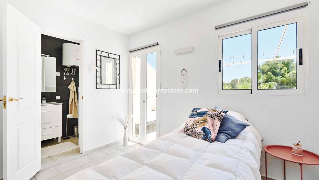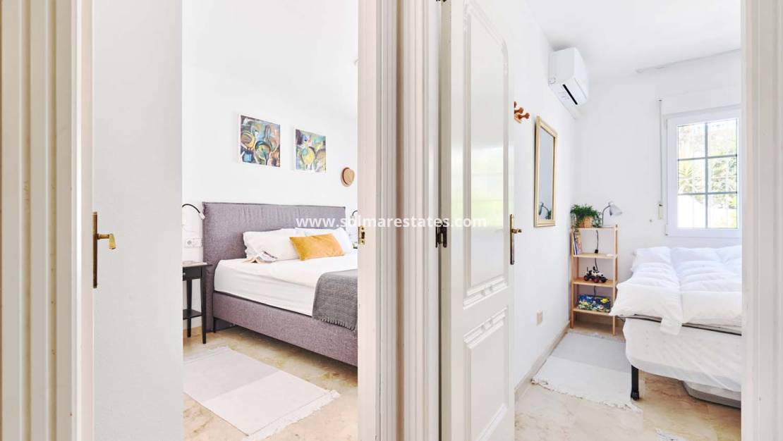 Deux chambres doubles au rez-de-chaussée, climatisées et équipées de placards intégrés. L'une d'elles comprend une salle de bains privative et des portes-fenêtres donnant sur un jardin arrière privé avec coin salon.