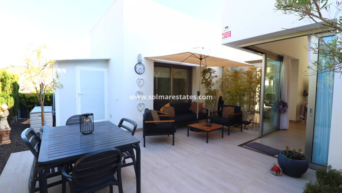 La cuisine ouverte moderne comprend une buanderie séparée. Les trois chambres doubles disposent de placards intégrés, de la climatisation et d'un accès direct au jardin. La suite parentale dispose d'un dressing et d'une salle de douche attenante. Une élégante salle de douche familiale complète l'intérieur.