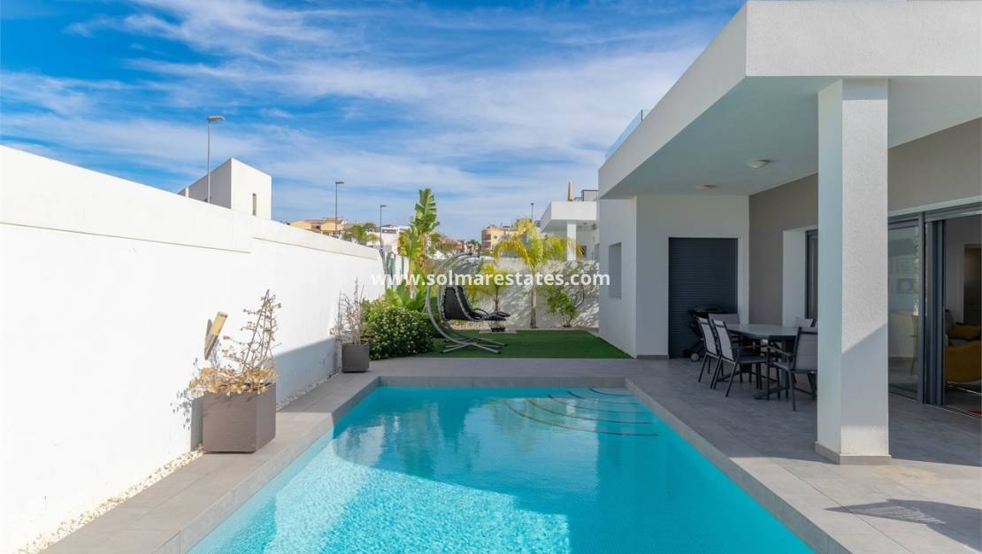 Cette villa d'angle, magnifiquement présentée et construite en 2016, offre trois chambres doubles et se situe à seulement 5 à 10 minutes à pied du centre-ville de Benijofar et de Benimar, à proximité de nombreux commerces. Les plages de sable de Guardamar del Segura sont à seulement 10 minutes en voiture.