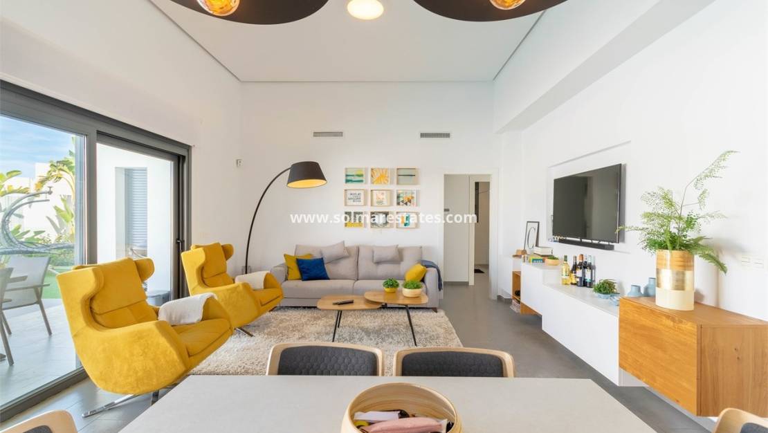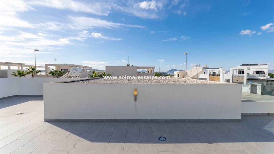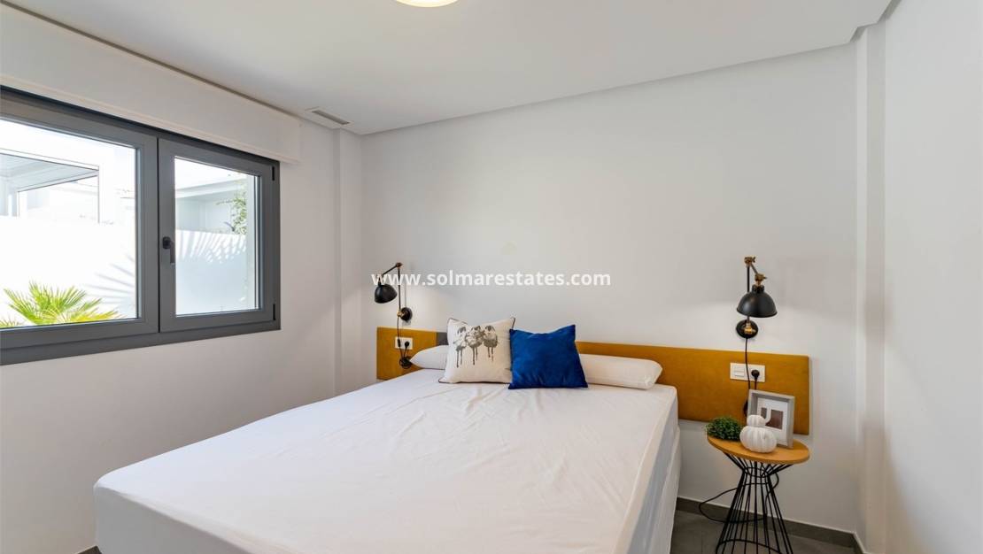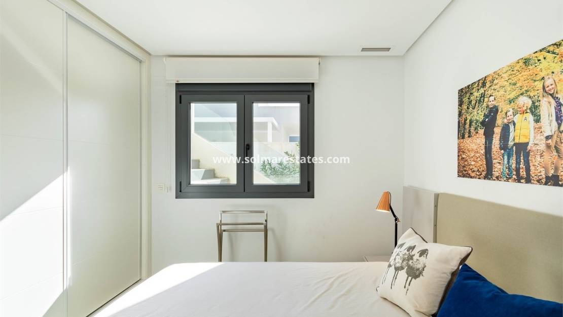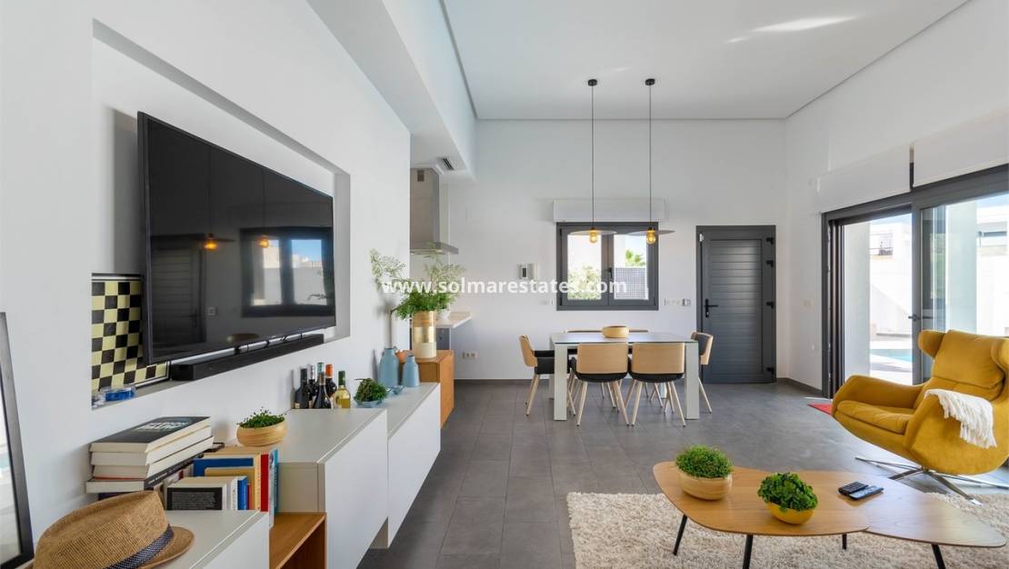 La villa est meublée et équipée avec un haut niveau de qualité. À l'intérieur, on trouve un hall d'entrée avec placards, une cuisine ouverte entièrement équipée, une buanderie séparée et un spacieux salon/salle à manger avec de grandes portes coulissantes donnant sur la terrasse partiellement couverte donnant sur le jardin privé et la piscine. La suite parentale comprend une salle de douche attenante, et toutes les chambres disposent de placards intégrés avec accès direct aux terrasses ou au jardin. La villa dispose également d'une salle de douche familiale, de la climatisation et du chauffage au sol dans les salles de bains.