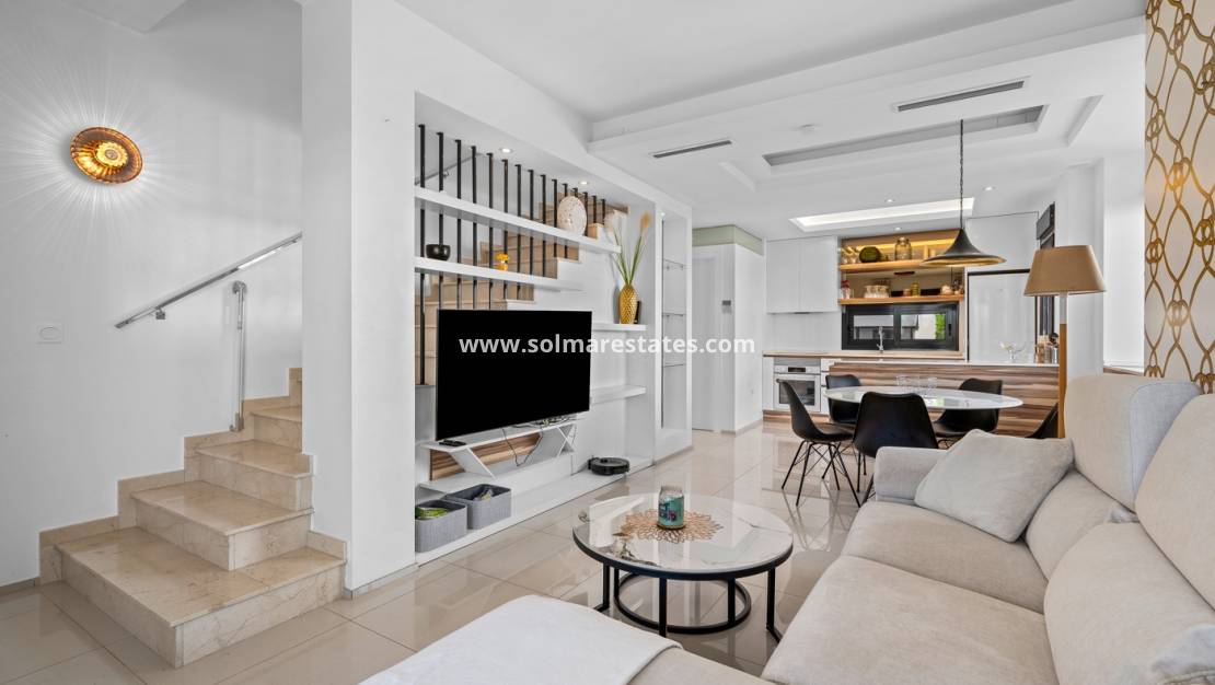 L'intérieur a été conçu avec soin, privilégiant la fonctionnalité et le confort. Au rez-de-chaussée, un vaste séjour communique harmonieusement avec une cuisine américaine moderne. Ces deux espaces s'ouvrent directement sur le jardin privatif, l'endroit idéal pour savourer son café du matin ou dîner au coucher du soleil bercé par la douce brise espagnole. Ce niveau comprend également des toilettes invités et une buanderie pratique.