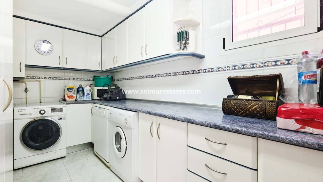 Un escalier intérieur, partant du salon, descend vers un charmant espace de vie ouvert comprenant salon et salle à manger, avec des portes-fenêtres donnant directement sur le jardin. Cet espace conserve un élégant style espagnol, avec ses carreaux muraux traditionnels, ce qui le rend idéal pour recevoir ou pour servir d'appartement d'invités indépendant. À l'arrière se trouve une buanderie spacieuse avec placards et lave-vaisselle. Attenante à la buanderie, on trouve une salle de bains familiale et une chambre double spacieuse. Le garage est également accessible depuis ce niveau par une porte située à côté de la buanderie.