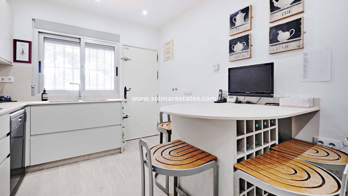 La cuisine rénovée et entièrement équipée est située à côté du salon et comprend une porte donnant directement sur la terrasse couverte et la piscine. Elle offre de nombreux rangements et un coin repas convivial pour les repas informels.