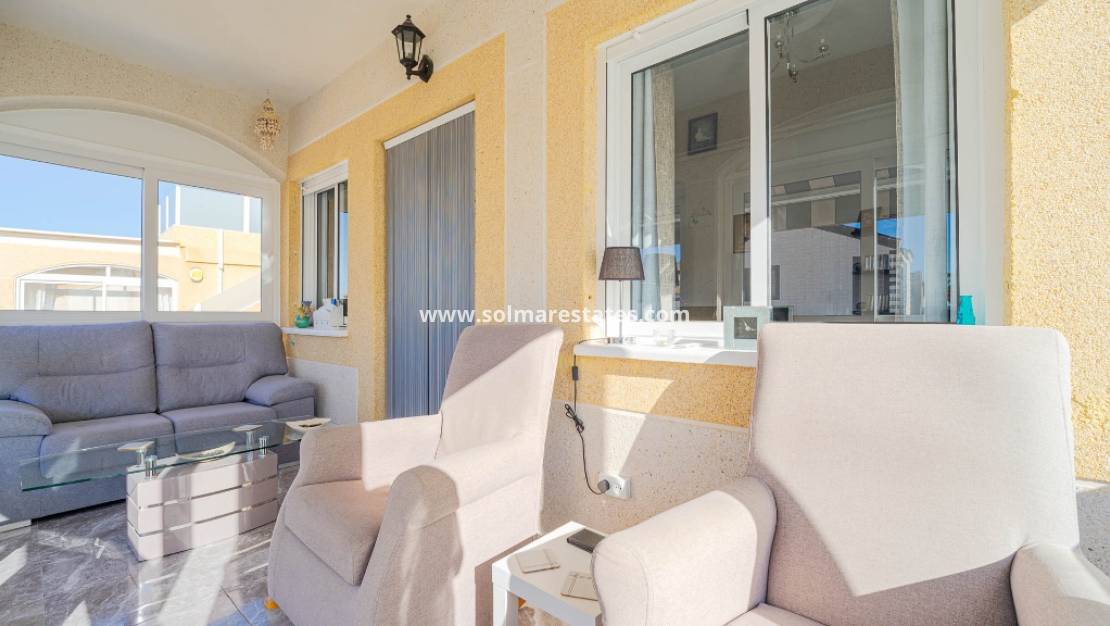 Un escalier intérieur mène au niveau principal, qui comprend une terrasse lumineuse avec store intégré, une cuisine moderne, un salon confortable, une salle de douche familiale et deux chambres doubles, toutes deux dotées de placards intégrés.