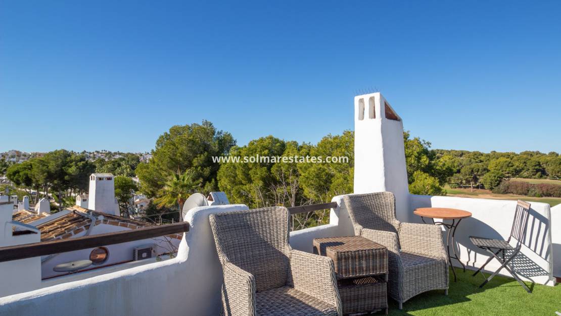 À l'étage, la pièce de vie principale, baignée de lumière naturelle, offre une vue imprenable sur les environs. Le rez-de-chaussée comprend un salon-salle à manger lumineux, une cuisine américaine avec un bar et des toilettes invités. De là, vous accédez au balcon et à la véranda privée, idéale pour profiter du soleil ou recevoir des invités tout en admirant la vue panoramique sur le golf de Villamartin.