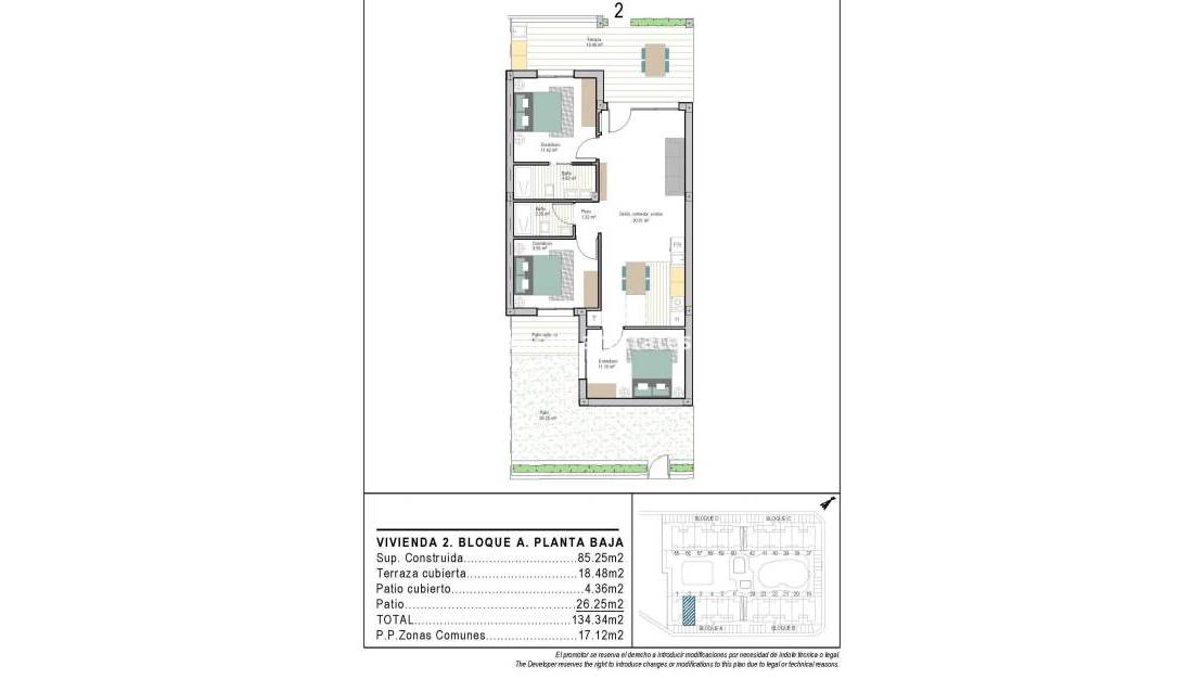 Appartements modernes neufs à San Cayetano, Torrepacheco, Murcie Une vie contemporaine dans un cadre méditerranéen paisible Ce nouveau complexe résidentiel exclusif est situé à San Cayetano, Murcie, dans la municipalité de Torre Pacheco, à seulement 9 km de la mer et entouré de plusieurs terrains de golf renommés. Le projet allie tranquillité, confort et design contemporain, offrant un environnement idéal pour y vivre à l'année, y passer ses vacances ou investir sur la Costa Calida. Le complexe comprend 72 appartements de 2 et 3 chambres et 2 salles de bains, dont une attenante, répartis dans quatre bâtiments modernes. Une deuxième phase avec des bungalows et des villas est également prévue, ce qui ajoutera encore plus de valeur et d'attrait à la région. Espaces communs conçus pour la détente et le bien-être Les résidents pourront profiter d'espaces communs soigneusement aménagés, comprenant deux piscines, de beaux jardins et une salle de sport entièrement équipée. Ces espaces créent un environnement agréable et convivial où les voisins peuvent se détendre, faire de l'exercice et profiter du style de vie méditerranéen. Le complexe résidentiel dispose également de panneaux solaires photovoltaïques de 40 kW qui contribuent à réduire les coûts d'électricité de la communauté, favorisant ainsi un cadre de vie plus durable et plus économe en énergie. Appartements avec espaces extérieurs privés et solarium Chaque appartement est conçu pour profiter au maximum de la vie en plein air. Les propriétés du rez-de-chaussée comprennent des jardins privés, les appartements du premier étage offrent des terrasses spacieuses et les maisons du dernier étage bénéficient à la fois d'une terrasse et d'un solarium privé sur le toit. Toutes les propriétés comprennent une cuisine d'été sur la terrasse ou le solarium, parfaite pour profiter du soleil toute l'année. Toutes les maisons sont équipées d'une place de parking extérieure et d'un débarras privé au sous-sol, ce qui ajoute un confort et une praticité supplémentaires. Caractéristiques de qualité et installations écoénergétiques Ces appartements neufs sont livrés avec des finitions de qualité et des installations modernes pour assurer confort et fonctionnalité, notamment : Cuisine entièrement équipée avec appareils électroménagers Salles de bains entièrement équipées avec meubles, miroir, éclairage et parois de douche Préinstallation pour la climatisation canalisée Système aérothermique pour l'eau chaude La combinaison de matériaux modernes et de systèmes à haute efficacité énergétique rend ces logements idéaux pour une utilisation tout au long de l'année. Excellent emplacement à proximité du golf, des plages et des services San Cayetano est un village calme et bien desservi, doté de commodités, de commerces et de services locaux. Son emplacement stratégique permet d'accéder facilement aux plages, aux terrains de golf et aux principaux réseaux de transport. Les distances clés vers les points d'intérêt sont les suivantes : Plages de Mar Menor 9 km Roda Golf 6 km Golf La Serena 14 km Los Alcazares 10 km Cartagena 30 km Aéroport de Murcie Corvera 25 km Aéroport d'Alicante 90 km Réservez dès aujourd'hui votre propriété à San Cayetano Ce complexe résidentiel moderne offre une excellente opportunité de profiter de la vie méditerranéenne dans un quartier paisible mais bien desservi. Contactez-nous dès aujourd'hui pour plus d'informations et réservez votre appartement neuf à San Cayetano.