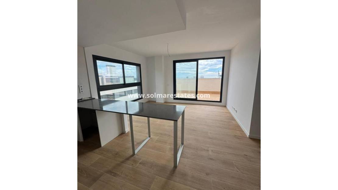 Penthouse neuf de 3 chambres avec vue sur la mer dans le centre d'Alicante, près de l'avenue Oscar Espla Emplacement privilégié au cœur de la ville d'Alicante Ce nouveau complexe exclusif de 28 appartements modernes de 2 et 3 chambres est situé à côté de l'Avenida Oscar Espla, l'une des principales avenues d'Alicante. Situé à proximité de l'Avenida Maisonnave, la rue la plus commerçante et la plus dynamique de la ville, le projet offre un emplacement central imbattable avec tous les services, magasins, restaurants et transports publics accessibles à pied. Depuis la propriété, vous pouvez rejoindre la gare TGV en seulement 10 minutes à pied. La gare routière, la promenade en bord de mer, le port de plaisance du port d'Alicante et la Playa del Postiguet sont tous à moins de 2 km. Les autoroutes A31 et AP7 offrent d'excellentes liaisons routières, et l'aéroport d'Alicante n'est qu'à 13 km, soit environ 13 minutes en voiture. Spacieux penthouse de 3 chambres avec terrasse de 40 m2 Ce superbe penthouse prêt à emménager offre une surface construite de 120 m2 répartie en trois chambres et deux salles de bains complètes. L'une des chambres se distingue par sa taille généreuse, ce qui la rend idéale comme suite parentale. Le grand salon est le cœur de la maison, baigné de lumière naturelle et offrant une vue magnifique sur la mer, ce qui crée une expérience de vie unique dans le centre-ville. Le point fort de la propriété est son impressionnante terrasse privée de 40 m², parfaite pour prendre ses repas en plein air, se détendre au soleil ou recevoir ses amis et sa famille tout en profitant d'une vue imprenable. Immeuble moderne avec des espaces communs haut de gamme L'immeuble est équipé d'un ascenseur et est entièrement adapté aux personnes à mobilité réduite. Les résidents peuvent profiter d'une piscine commune sur le toit et d'un solarium, idéaux pour se rafraîchir pendant les chauds étés méditerranéens. Il y a également un espace de stationnement réservé aux vélos. La propriété comprend une place de parking privée souterraine et un débarras, ajoutant confort et praticité à la vie quotidienne. Spécifications de qualité et efficacité énergétique L'appartement est livré avec des finitions de haute qualité, notamment une cuisine équipée avec plaque vitrocéramique, four et hotte aspirante, des armoires encastrées, une porte d'entrée renforcée et un système aérothermique pour l'eau chaude. La menuiserie extérieure est composée de cadres en aluminium à rupture thermique avec double vitrage pour une meilleure isolation. La climatisation et le chauffage par pompe à chaleur assurent un confort tout au long de l'année. La vie urbaine au bord de la mer Ce penthouse combine espace, vue sur la mer et emplacement central privilégié à Alicante. Contactez-nous dès aujourd'hui pour obtenir plus d'informations ou pour organiser une visite de cette exceptionnelle propriété neuve. 857